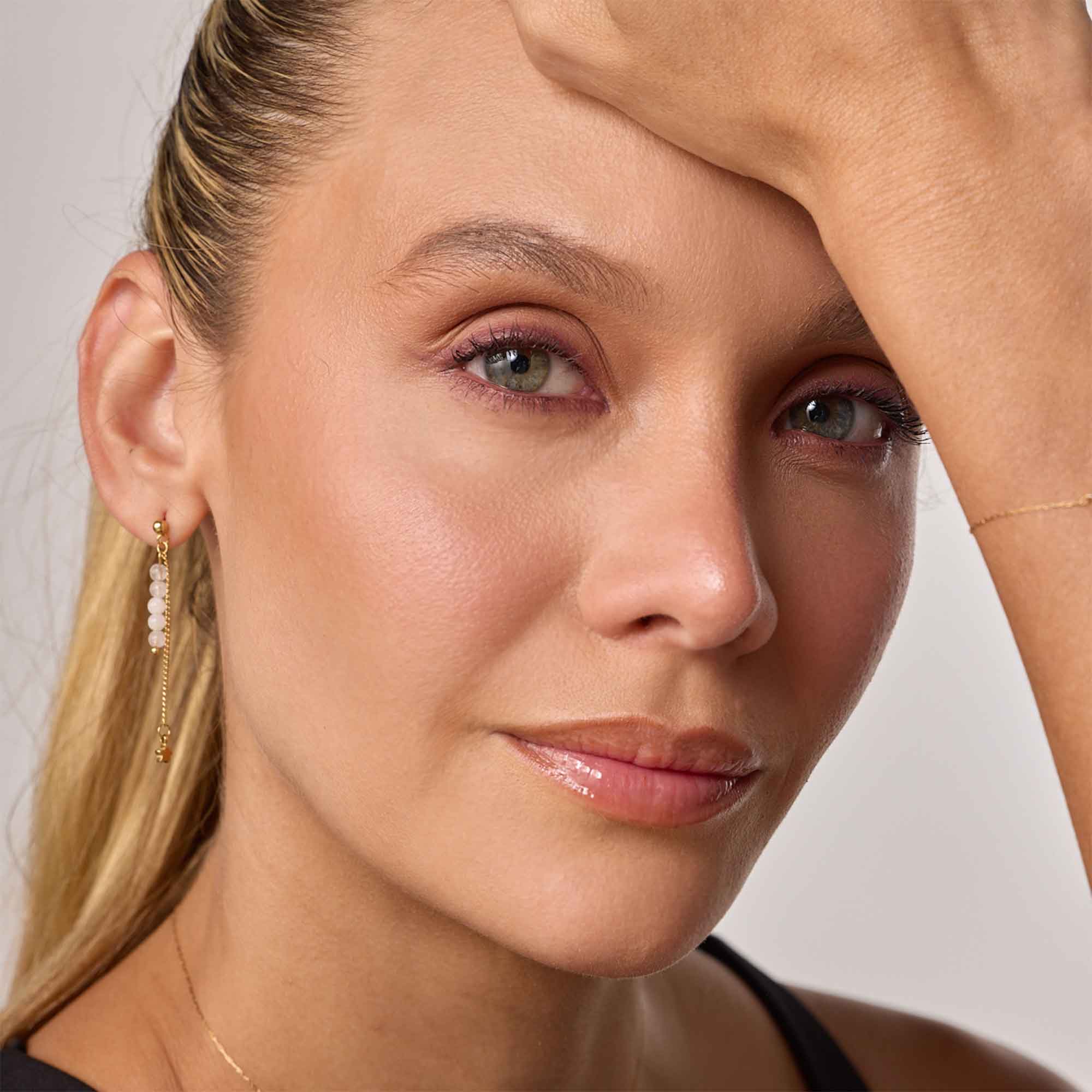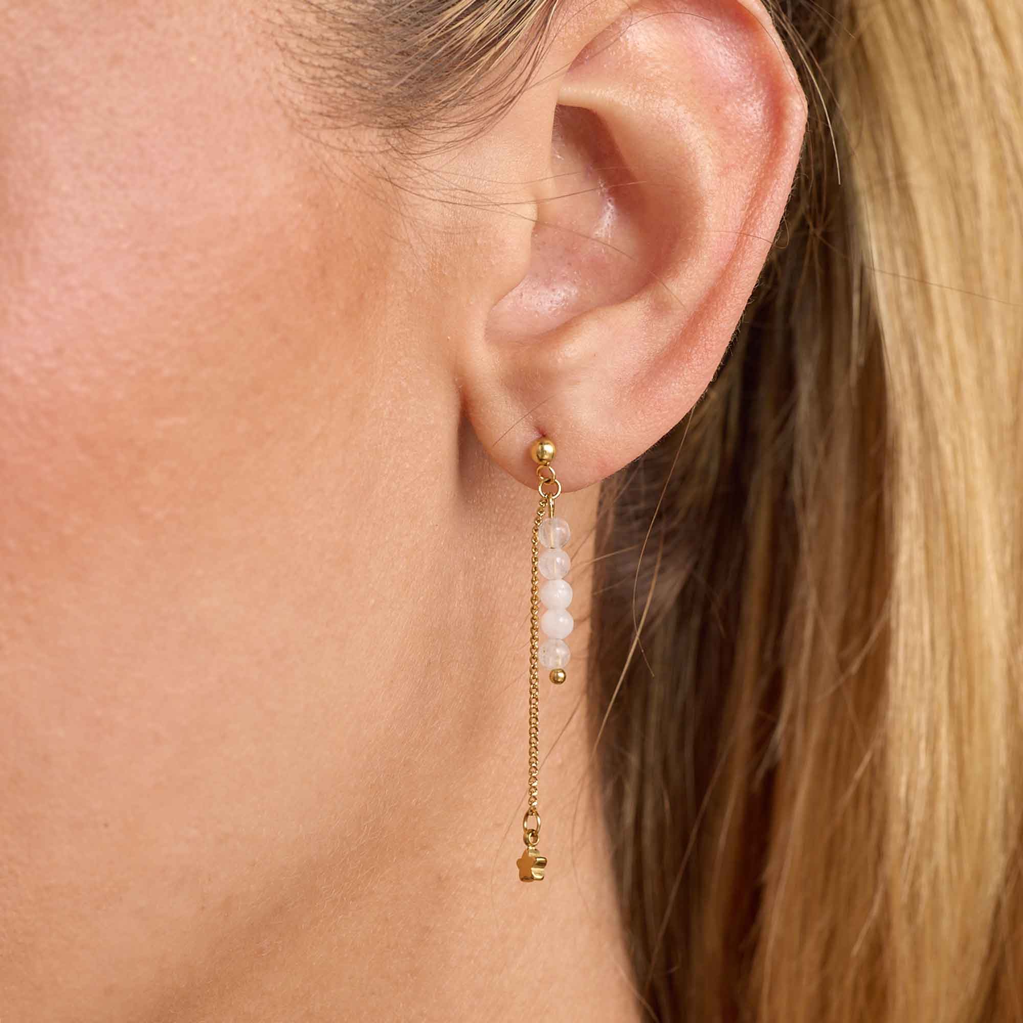 Los Aretes Estrellitas Nieve capturan la magia de lo sutil con un diseño ligero, delicado y lleno de encanto. Su estructura en cadena delgada sostiene pequeñas piedras naturales de Jade blanco que evocan copos de nieve cayendo suavemente, mientras un dije metálico en forma de estrella brilla con cada movimiento. El resultado es una joya femenina, soñadora y moderna, perfecta para quienes aman los detalles que no pasan desapercibidos.