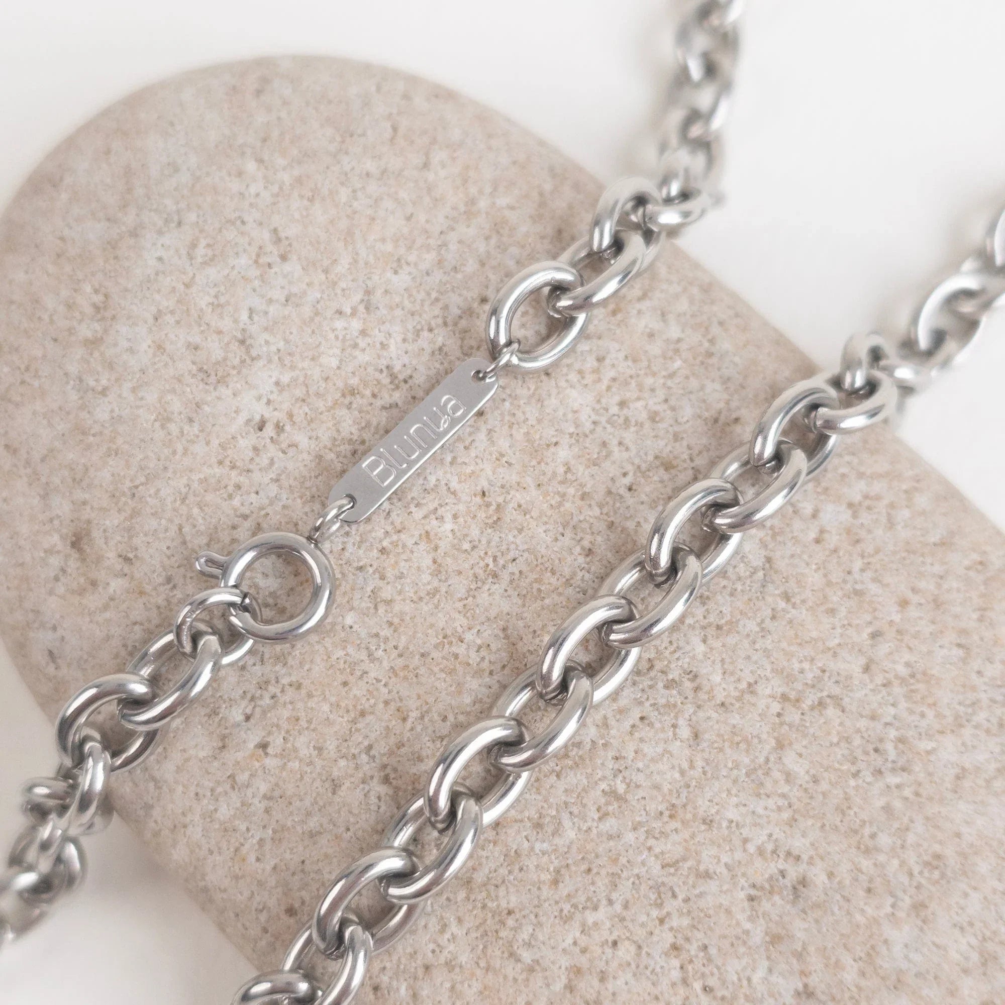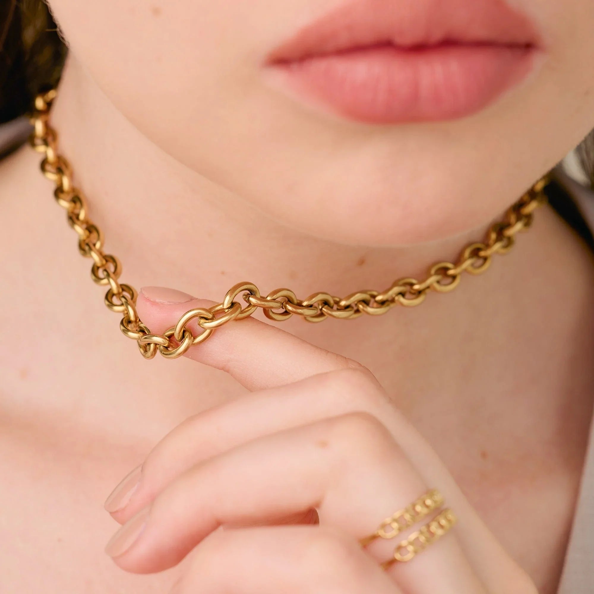 El Collar Bel destaca por su diseño robusto de eslabones entrelazados, creando una textura marcada y envolvente que abraza el cuello con carácter. Su estética industrial y elegante transmite seguridad, estilo y presencia.  No solo adorna: afirma y transforma tu look en una declaración visual