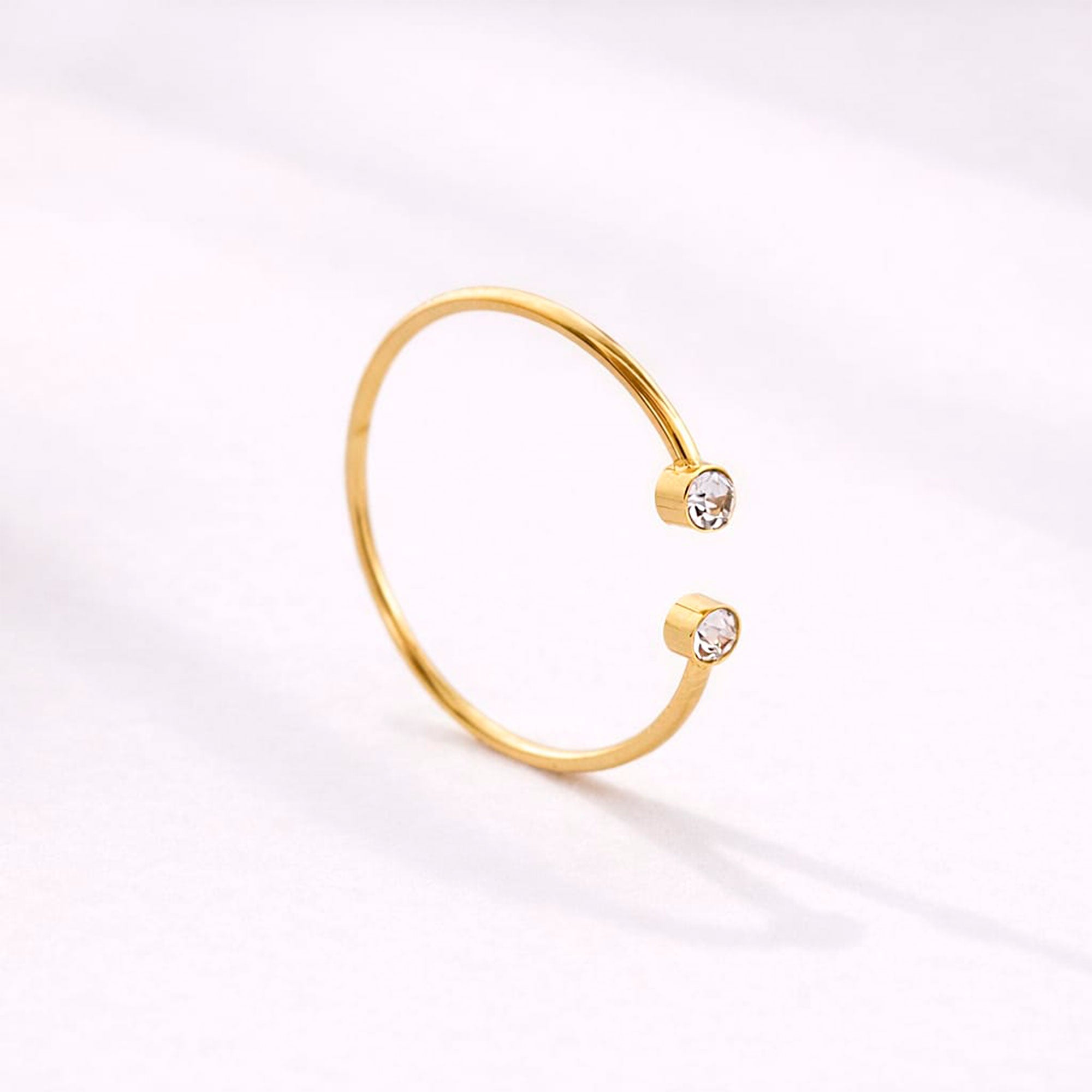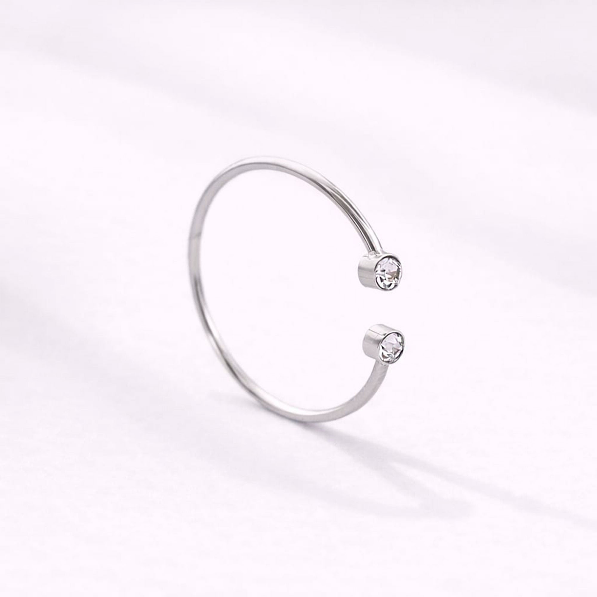 El Anillo Mirror es una joya graduable de diseño abierto y minimalista que se ajusta con elegancia al dedo. Su banda delgada y pulida termina en dos pequeñas piedras redondas de color blanco, que aportan brillo sutil y un toque sofisticado. La forma abierta permite adaptarlo cómodamente, creando un efecto moderno y delicado. Es ideal para usar solo o combinar con otros anillos finos, elevando cualquier look con discreta elegancia.