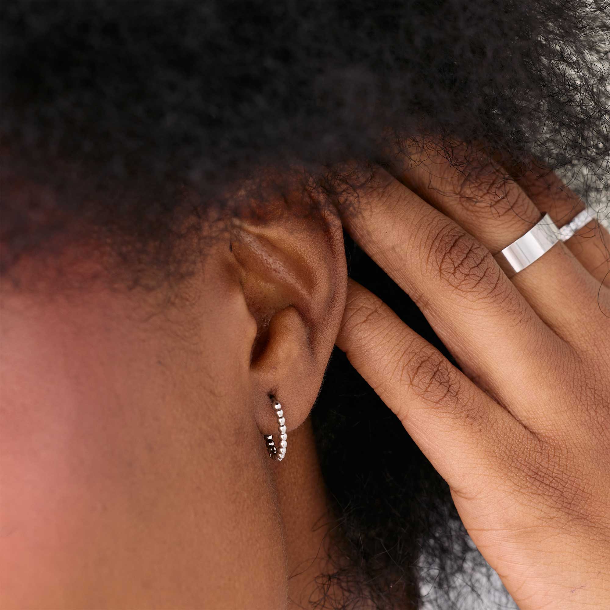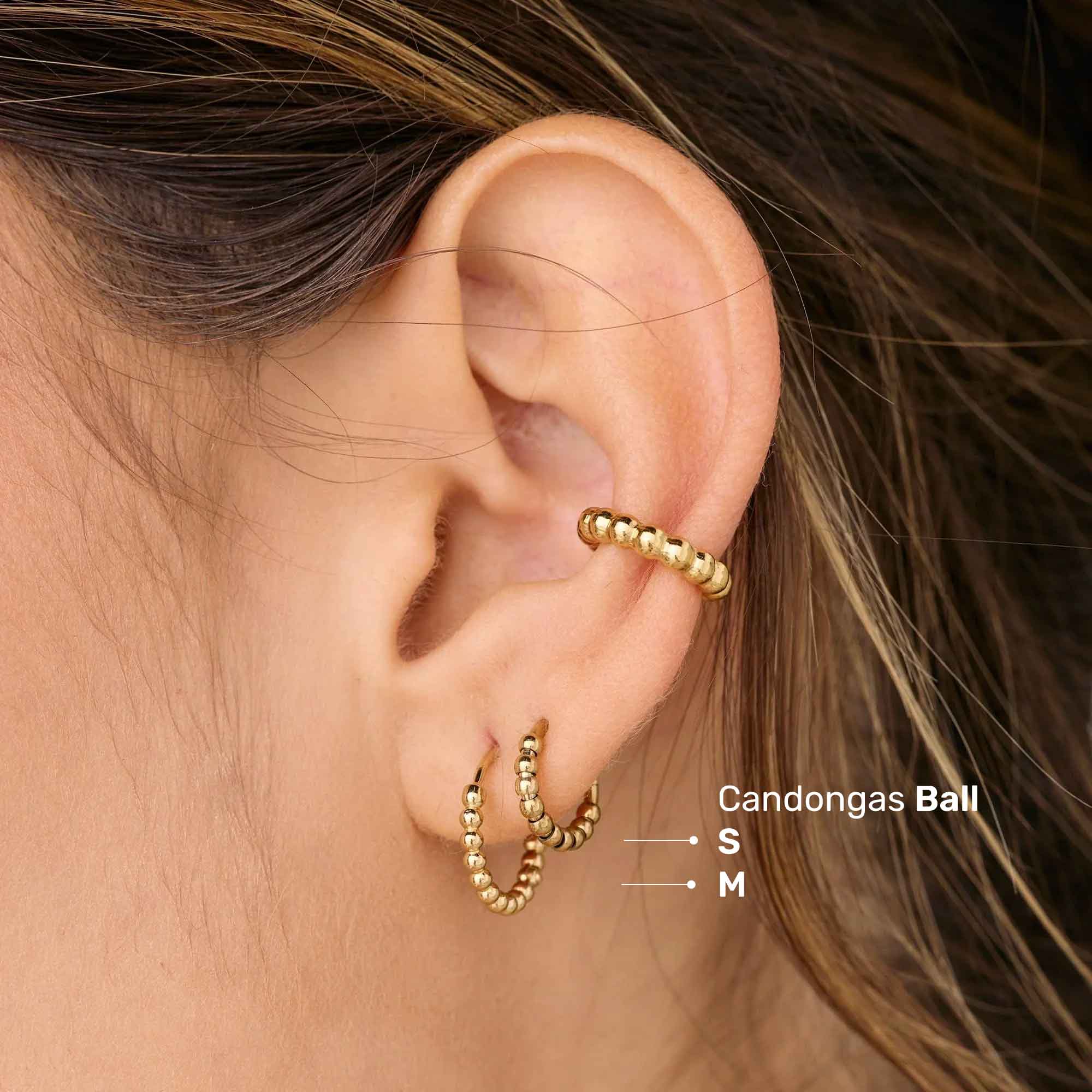 Las Candongas Ball y su diseño con pequeñas esferas unidas crea una textura delicada y moderna que aporta brillo con sutileza. Son livianas, cómodas y perfectas para quienes prefieren accesorios versátiles y para el día a día. Disponibles en dos tamaños: la talla S, perfecta para la segunda perforación, y la talla M, ideal para usar en la principal.