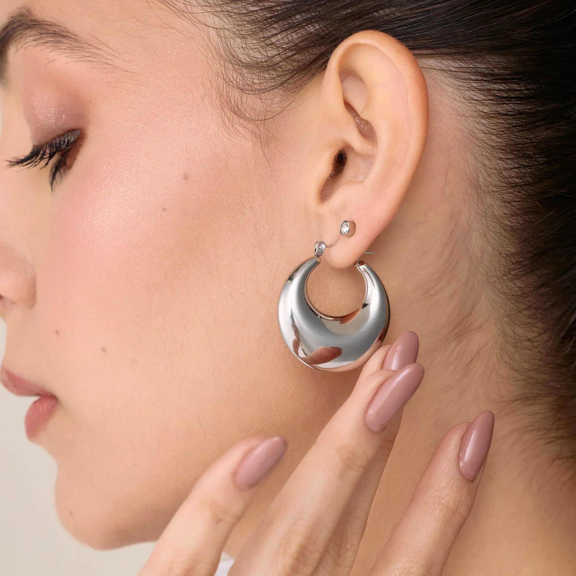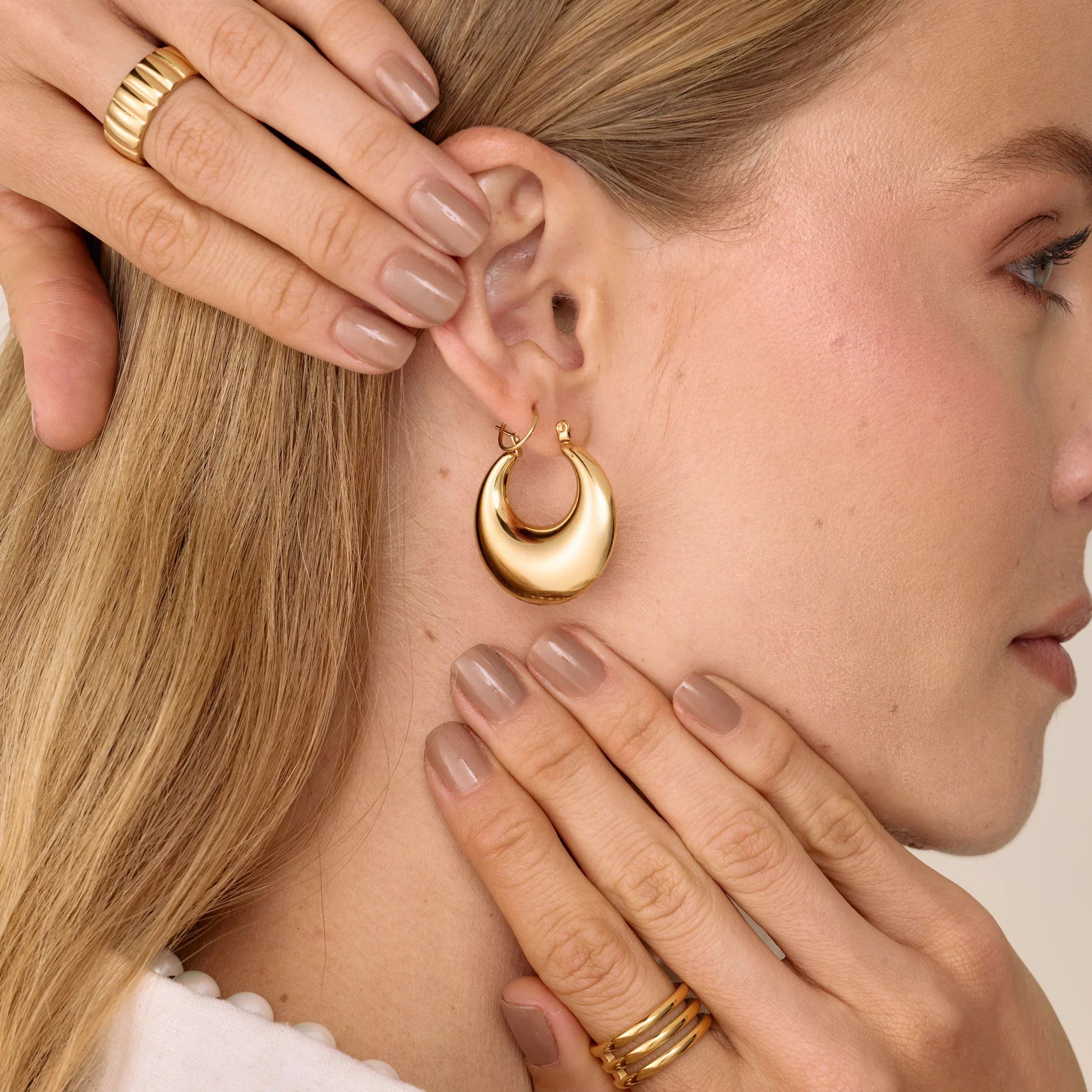 Las Candongas Dune tienen una silueta en forma de medialuna, con acabado pulido y volumen generoso. Su diseño curvo y envolvente crea una presencia elegante que fluye con cada movimiento. Son joyas que abrazan el rostro con luz, como una ola que se posa con intención.