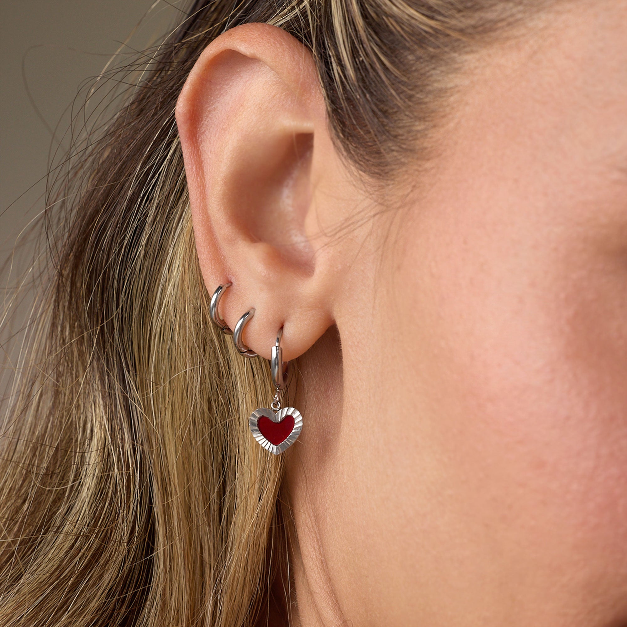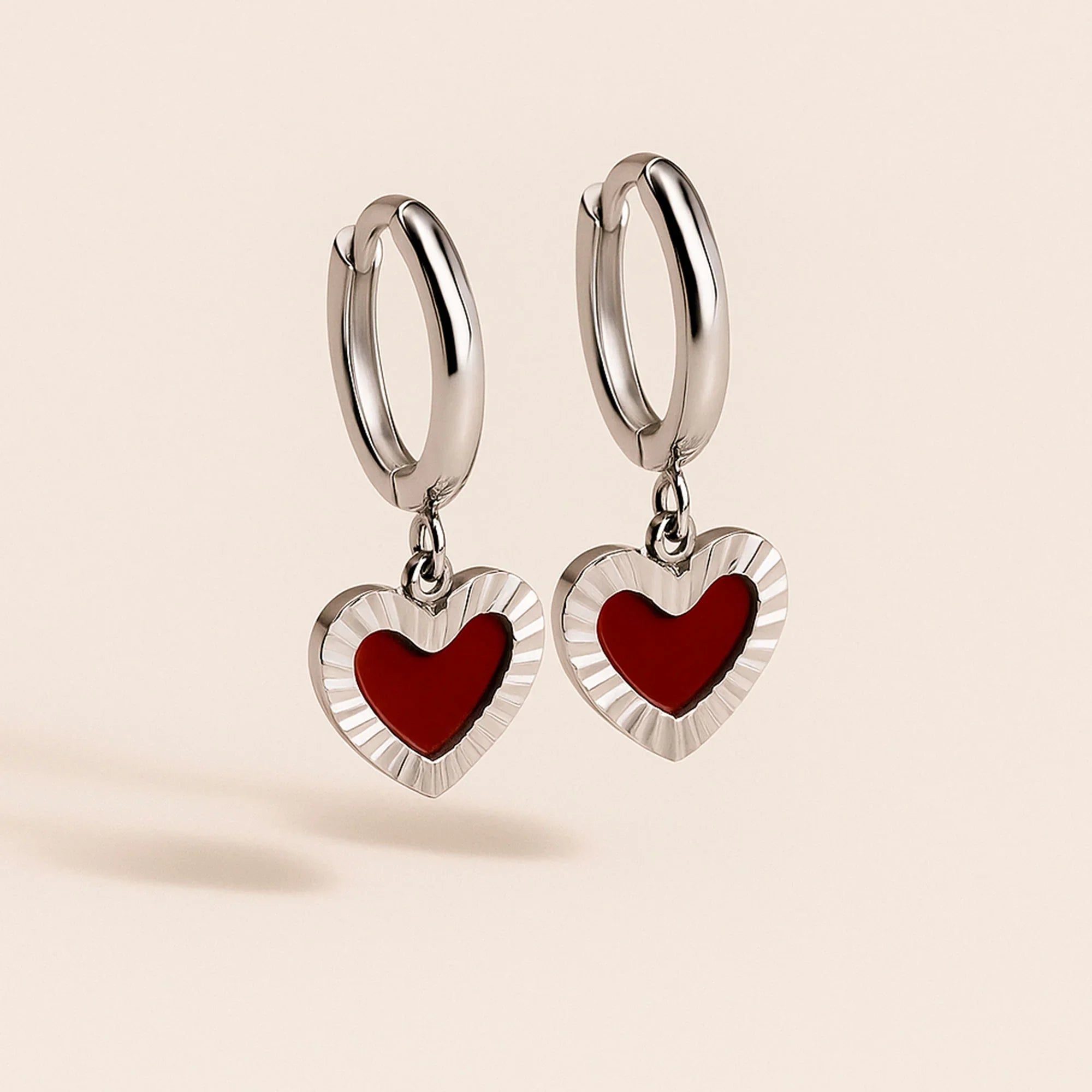 Candongas doradas con dije en forma de corazón rojo vino. El borde acanalado refleja la luz y el centro color vino resalta con intención.  Ligeras, vibrantes y diseñadas para acompañarte desde el primer café hasta el último plan del día.