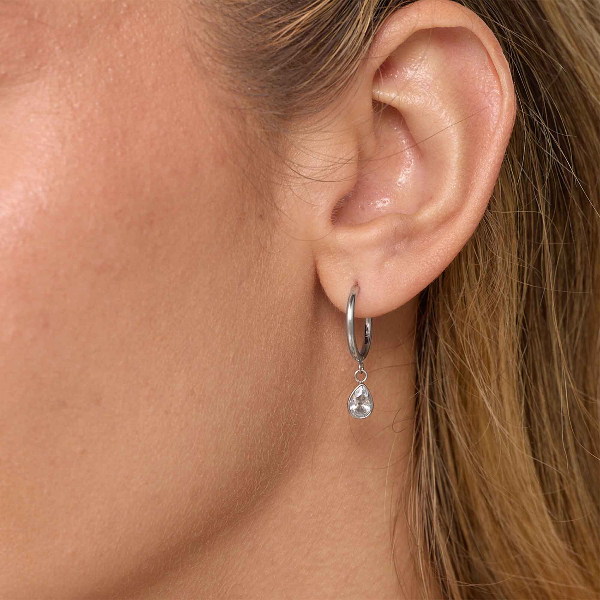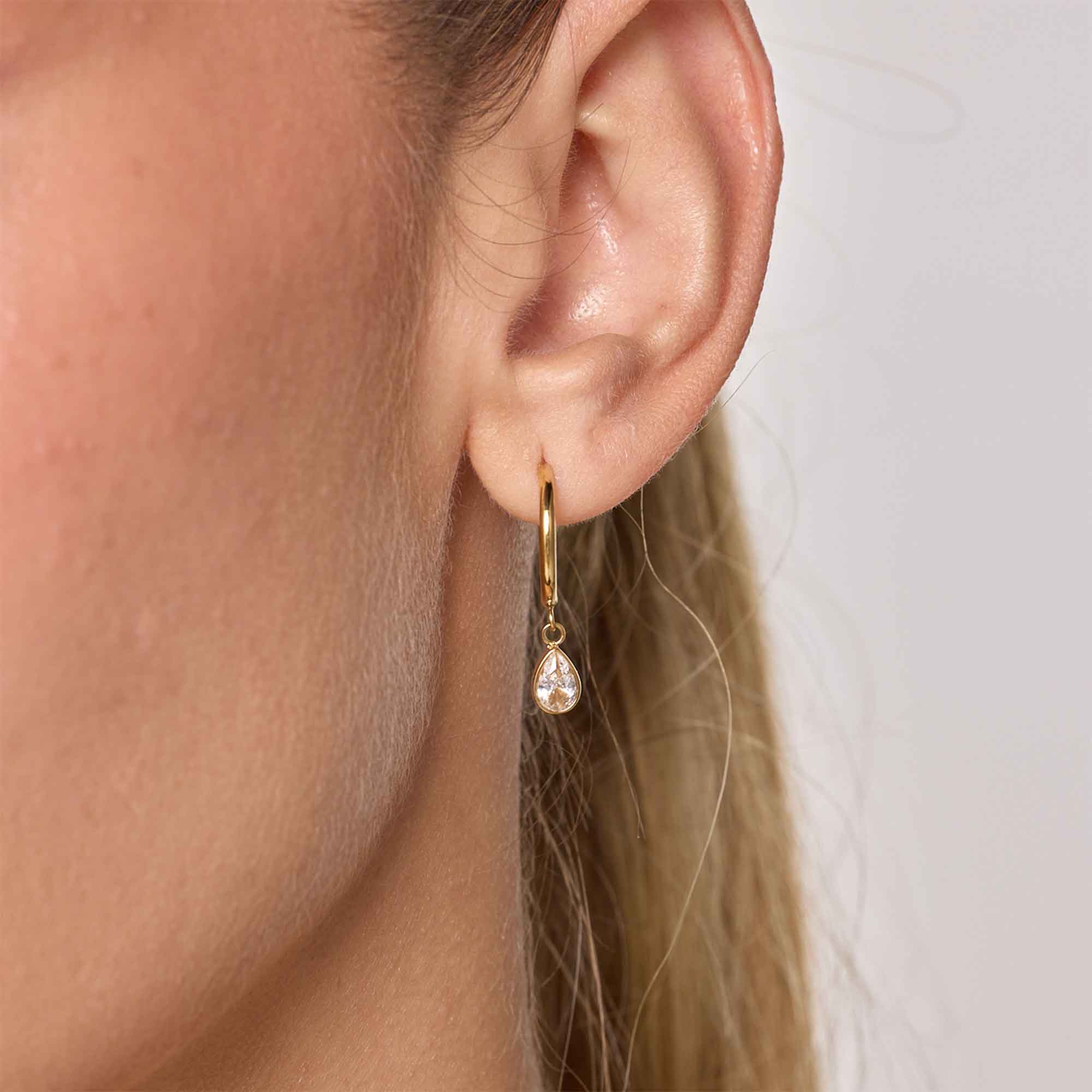 Las Candongas Selene delicadas y femeninas. Su estructura presenta una argolla fina de la que cuelga un dije en forma de gota con cristal zirconia cúbica, son ligeras y fáciles de llevar, son perfectas para acompañarte durante todo el día.