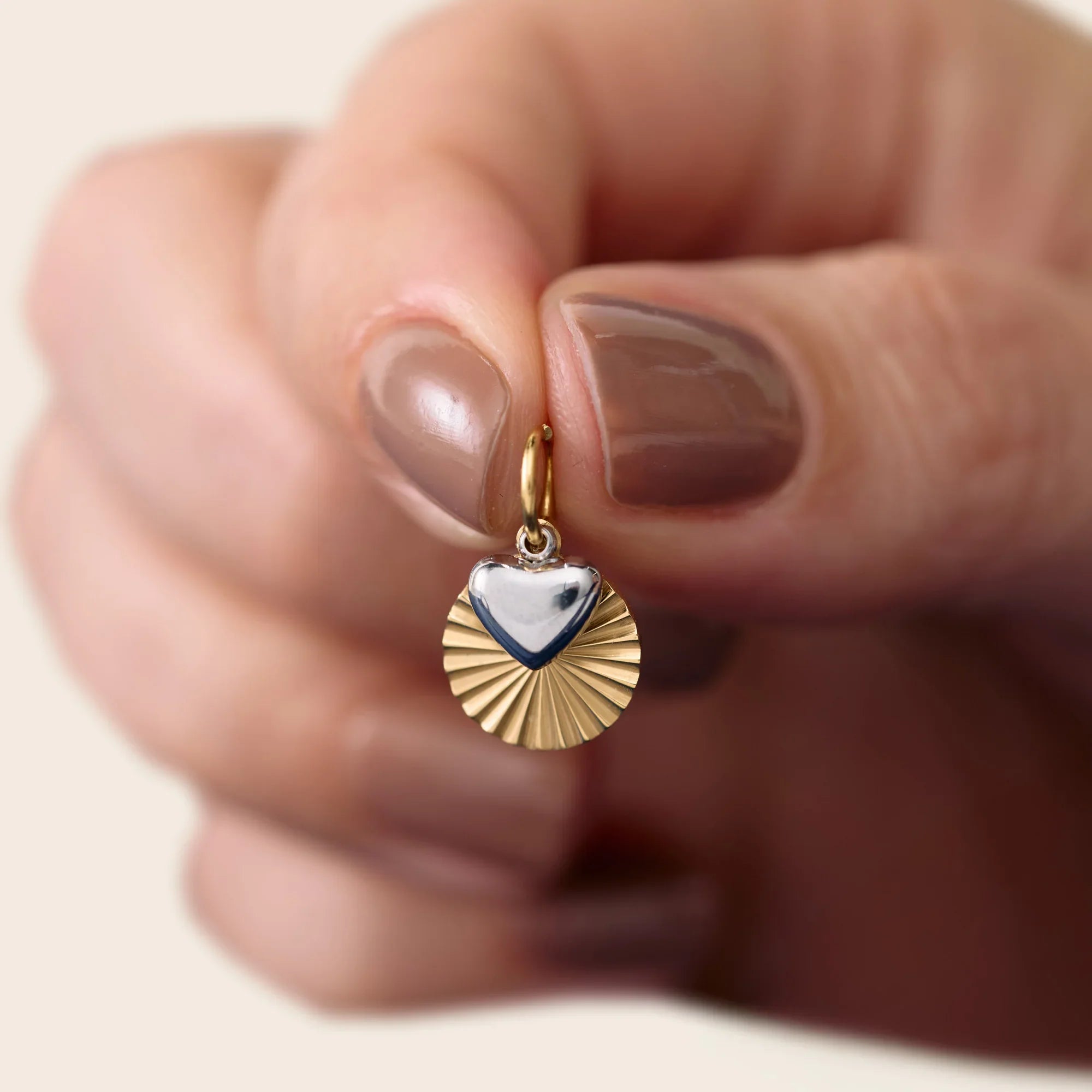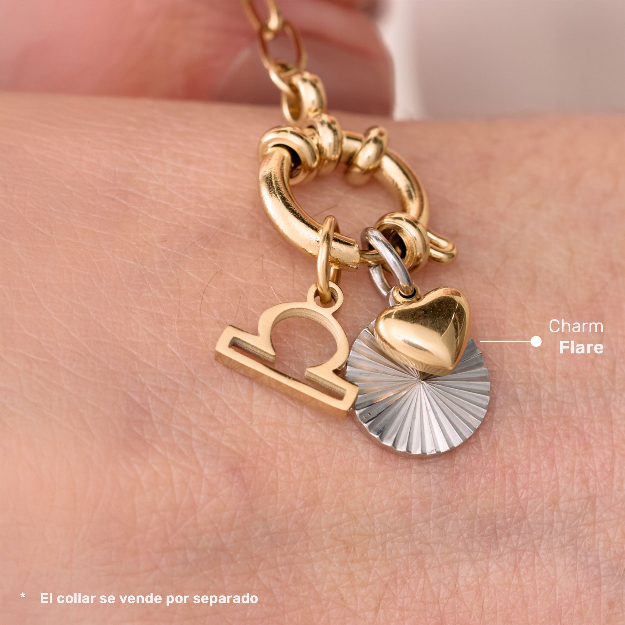 El Charm Flare es una composición de dos elementos: un corazón liso y un disco con textura radial. Juntos transmiten dualidad, calidez y expansión: como una joya que combina afecto y luz, emoción y presencia. Su diseño juega con el contraste de acabados y colores, creando una pieza que vibra con estilo.
