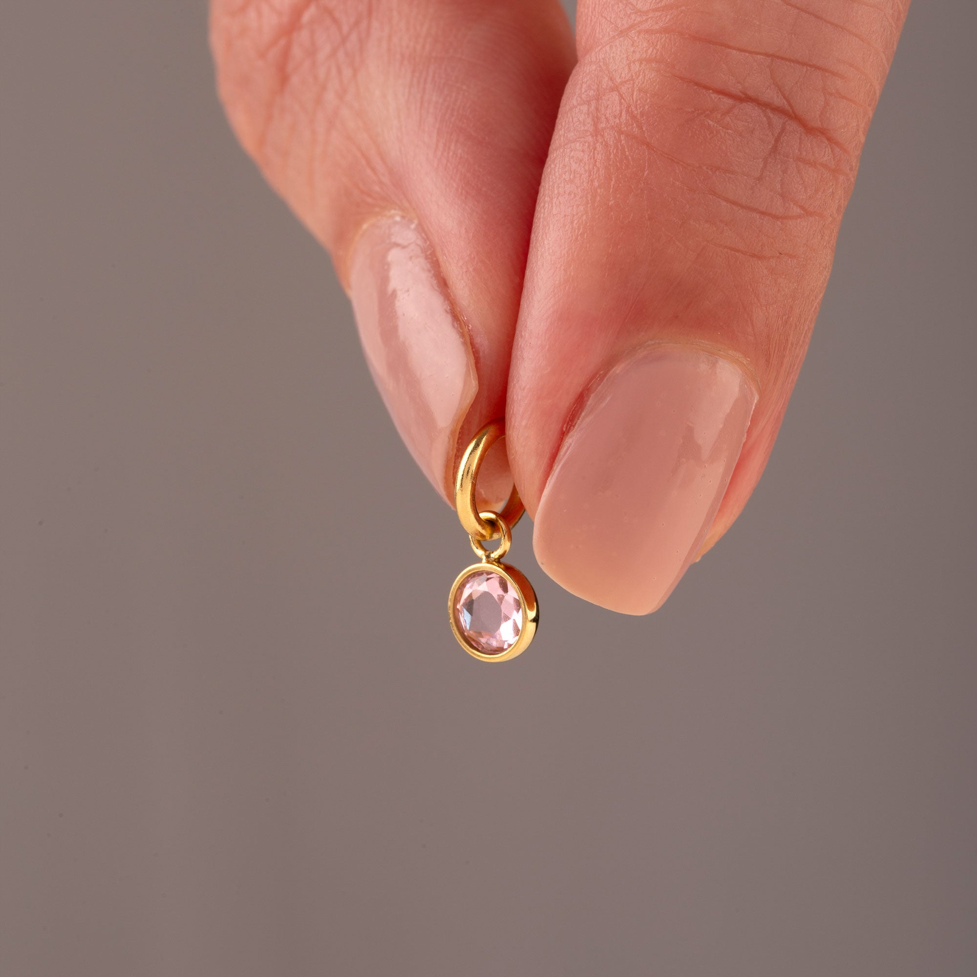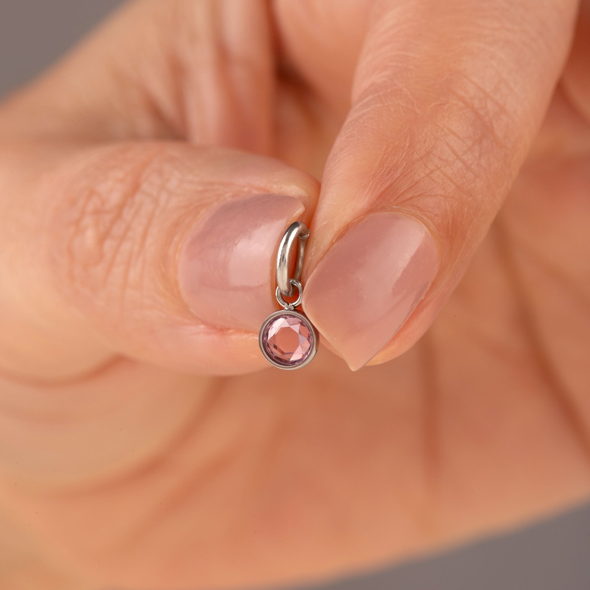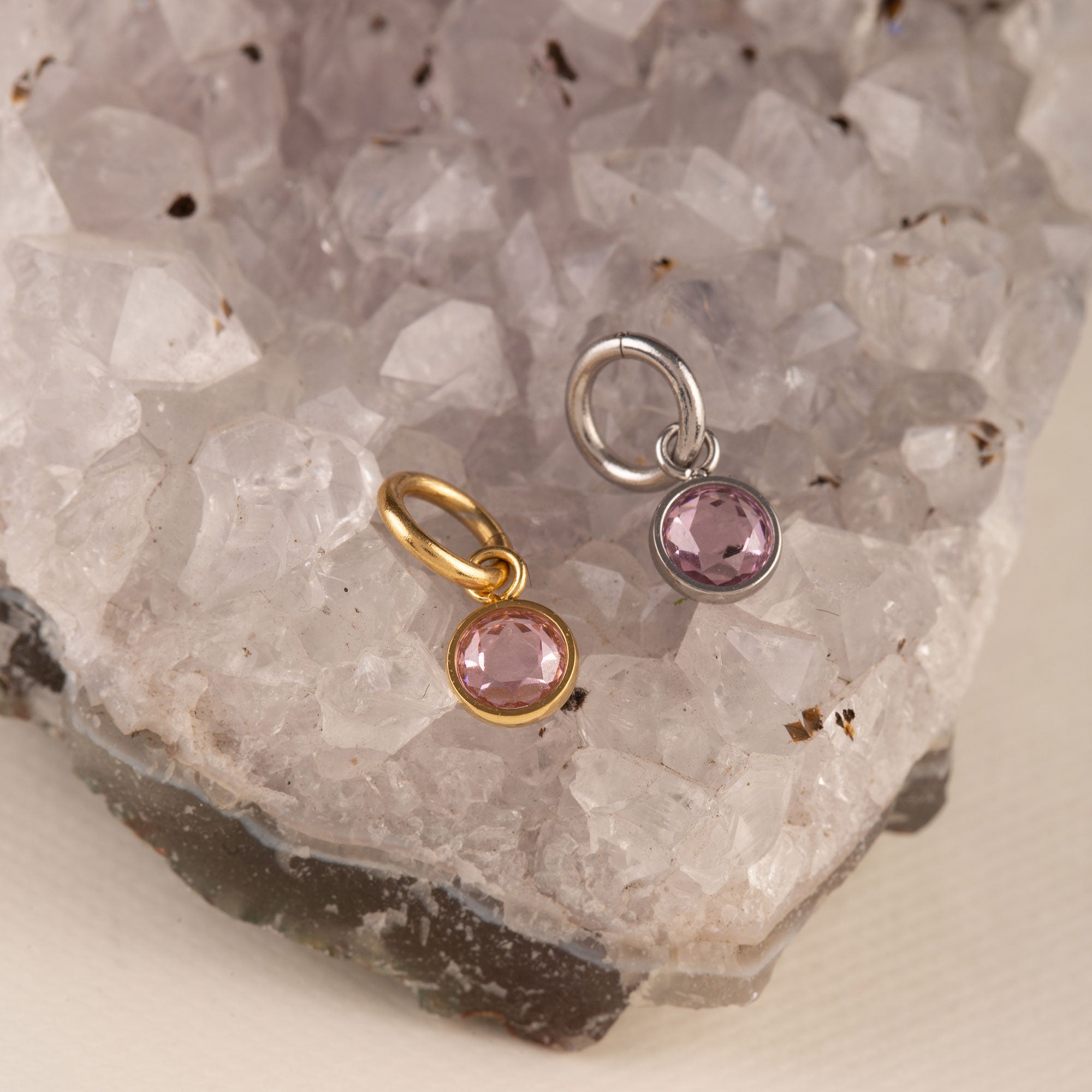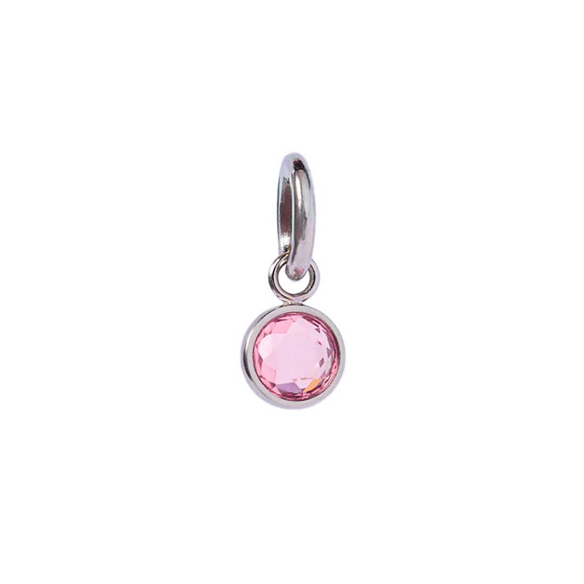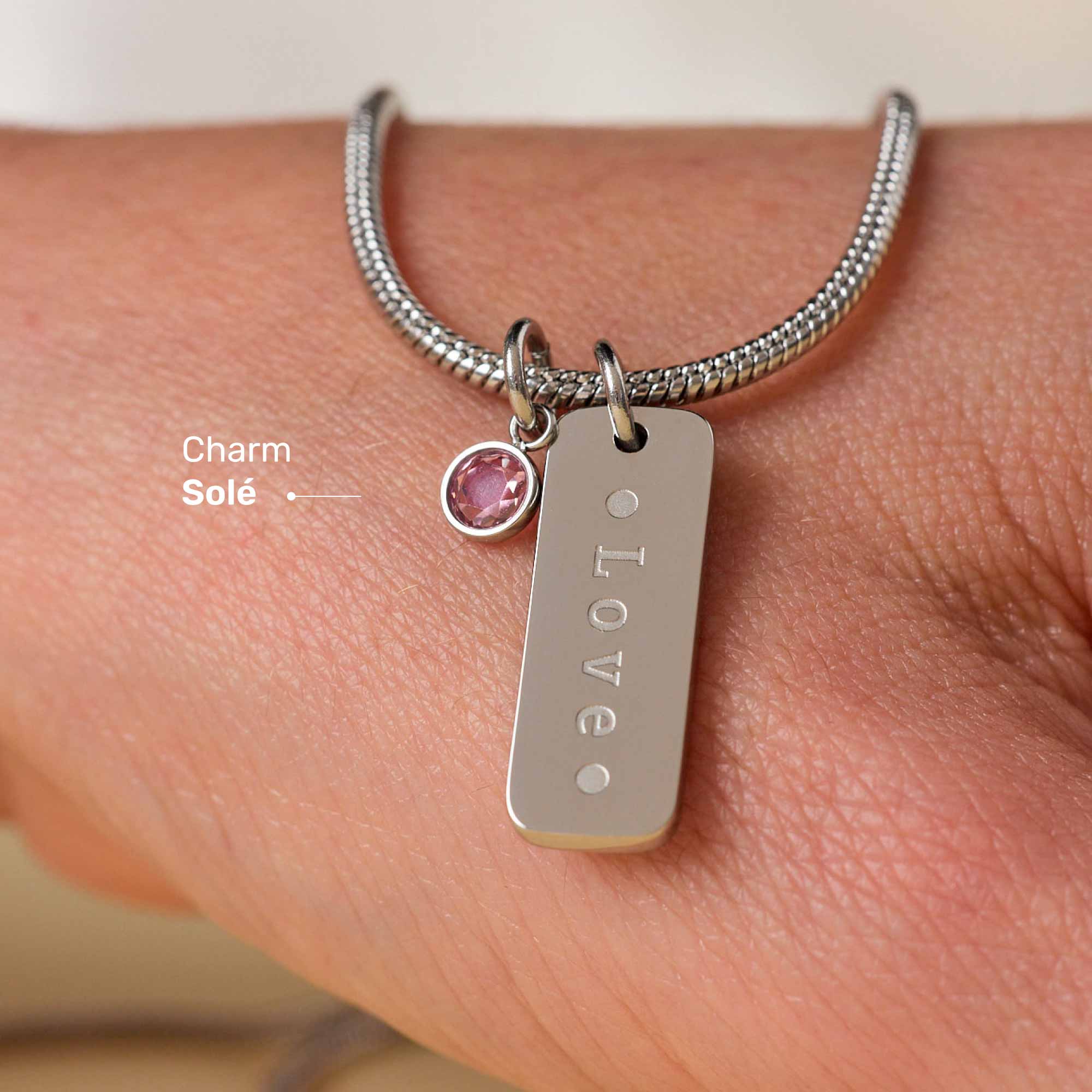 El Charm Solé es una joya que refleja la sutileza de la luz y el romanticismo en un diseño compacto y elegante. Elaborado en acero quirúrgico hipoalergénico, resistente al agua y pulido a mano, este dije redondo alberga una piedra tipo cristal en tono rosa claro que captura la luz con suavidad.