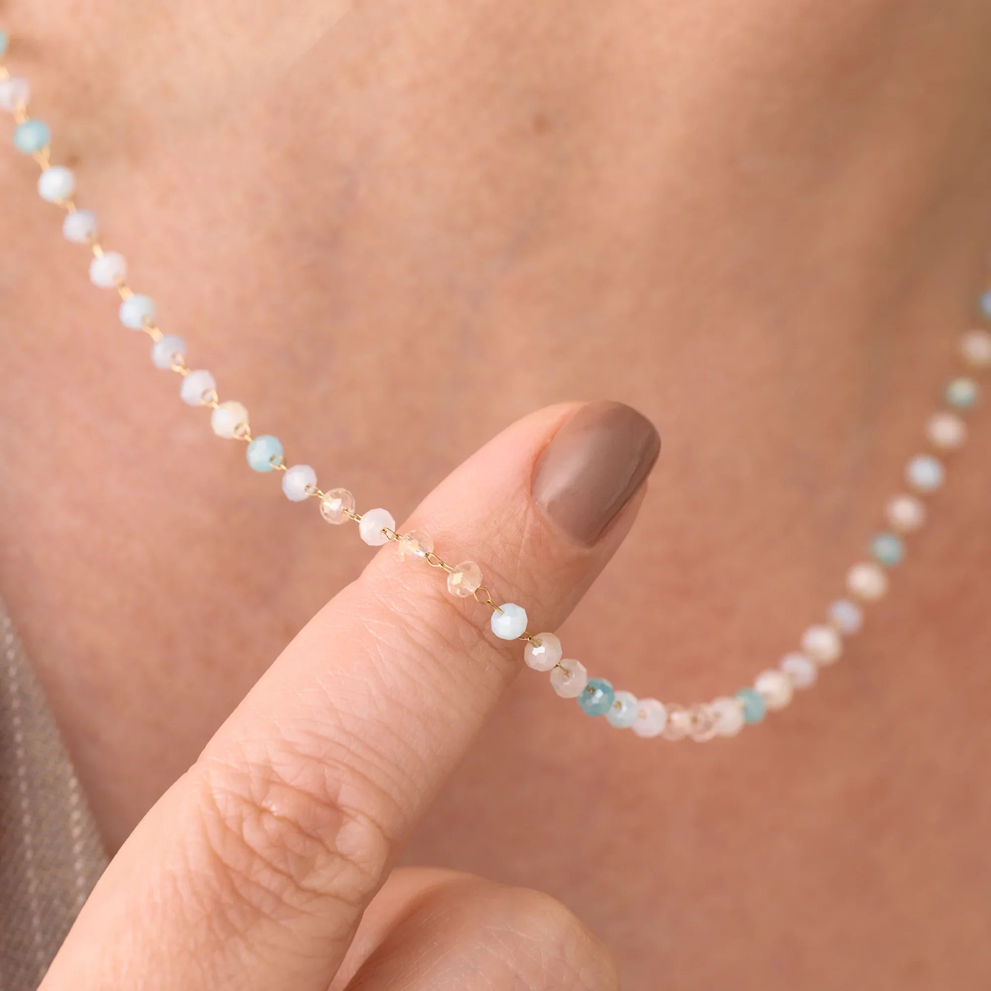 El Collar Heaven está compuesto por cuentas redondas en tonos pastel, dispuestas sobre una cadena delicada que abraza el cuello con ligereza. Su diseño es simétrico, alegre y pensado para transmitir calma y dulzura en cada detalle. Es una joya que acompaña con suavidad, como un gesto cotidiano que ilumina.