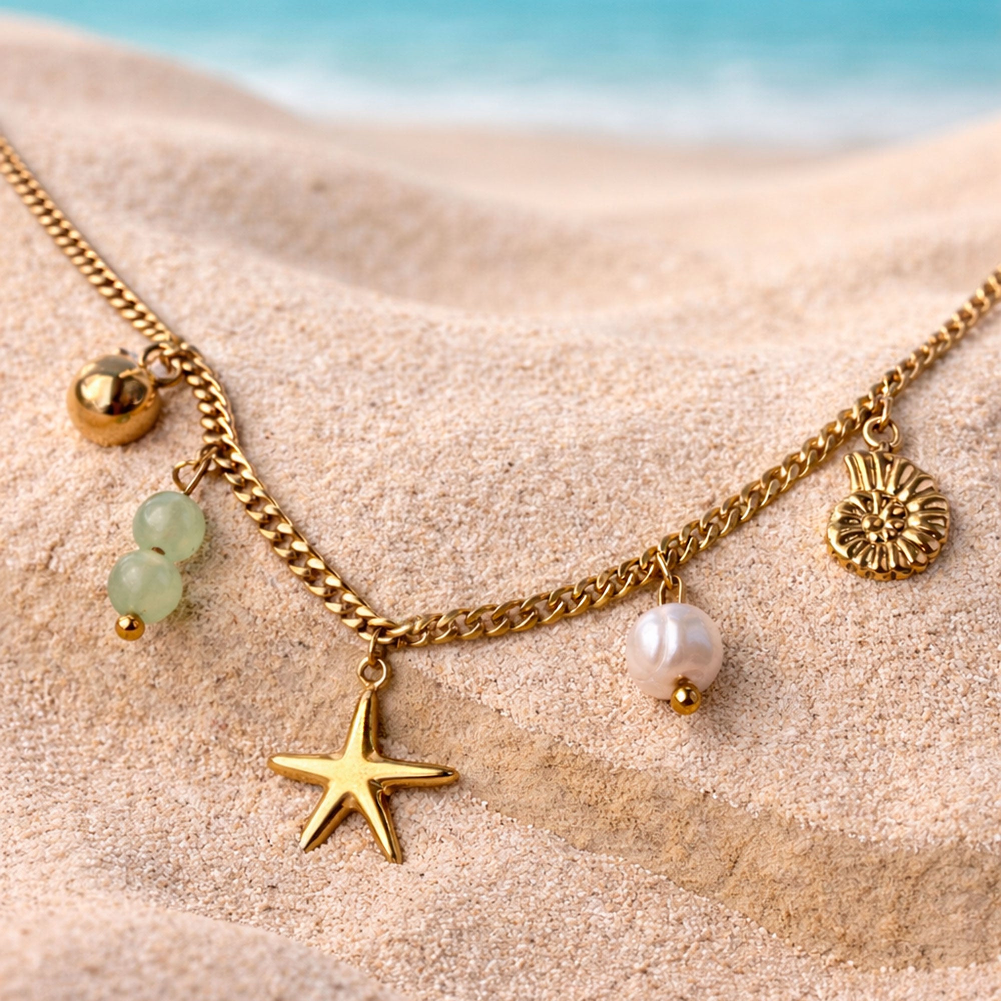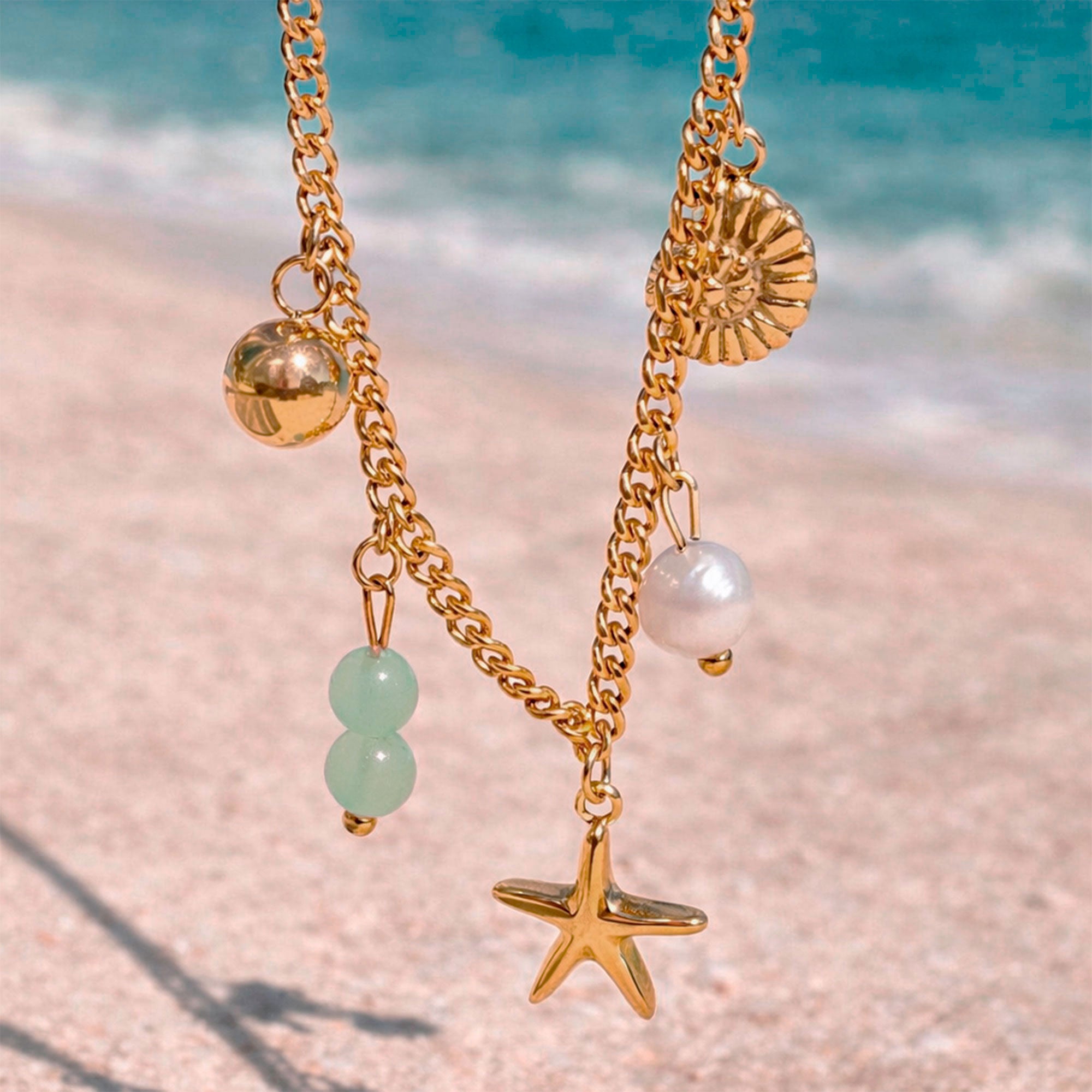 El Collar Mare es una joya inspirada en el mar y sus pequeños tesoros. Su diseño combina una cadena dorada con dijes que evocan la playa: estrella de mar, perla natural, concha y delicados detalles en tono verde suave que aportan frescura y equilibrio.