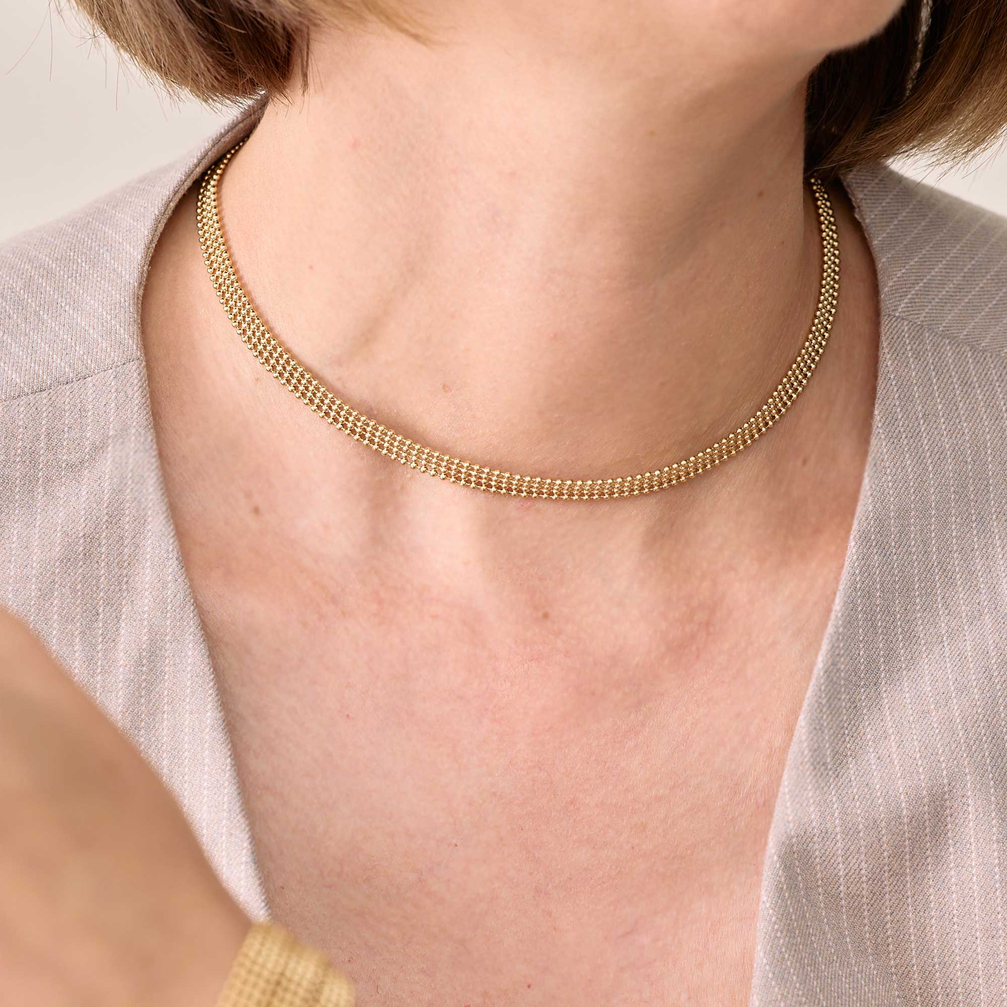 El Choker Juno está compuesto por una malla fina que se ajusta con suavidad al cuello, creando una textura moderna y envolvente. Su diseño estructurado y flexible transmite sofisticación, equilibrio y estilo urbano. Es una joya que se siente como una segunda piel: ligera, segura y con carácter.