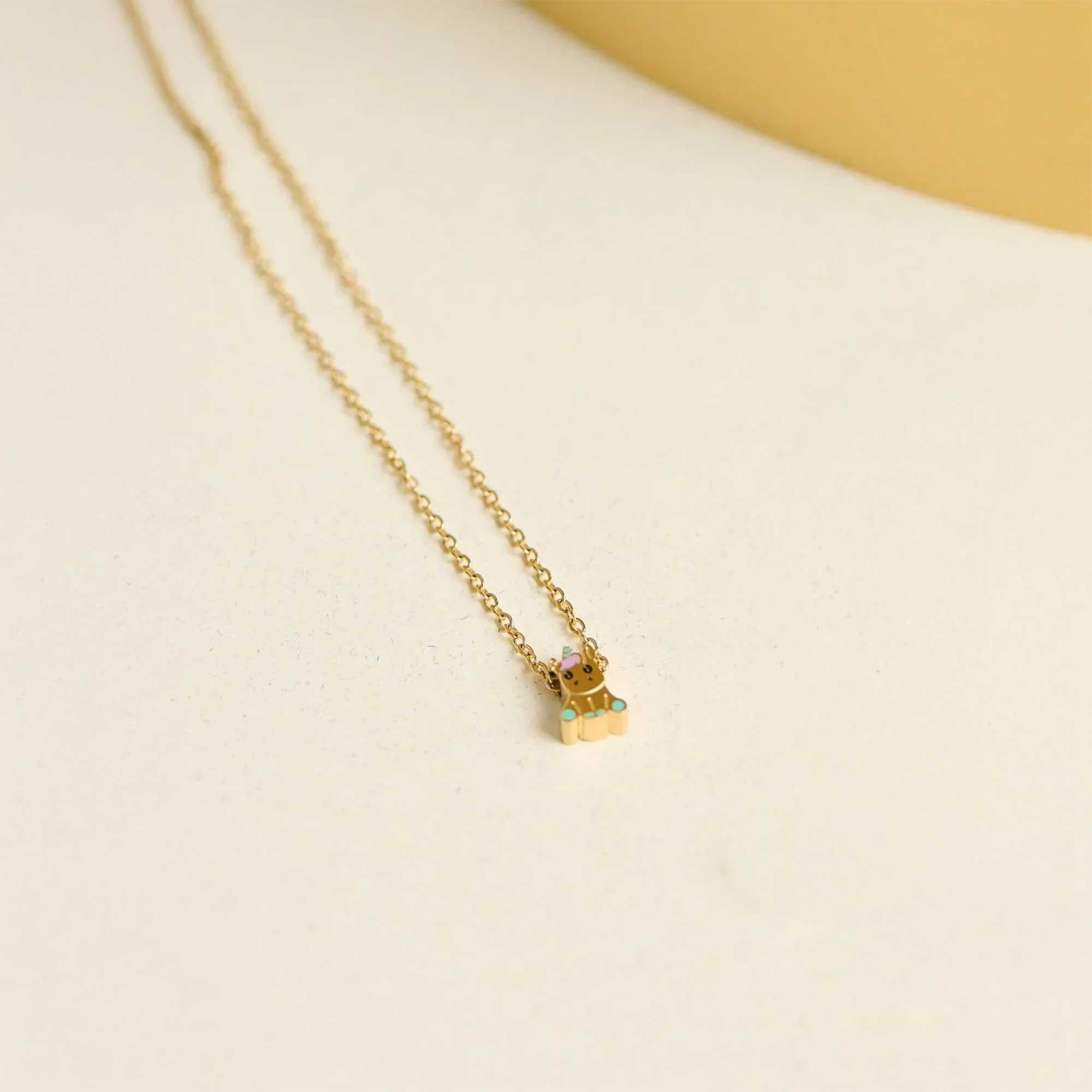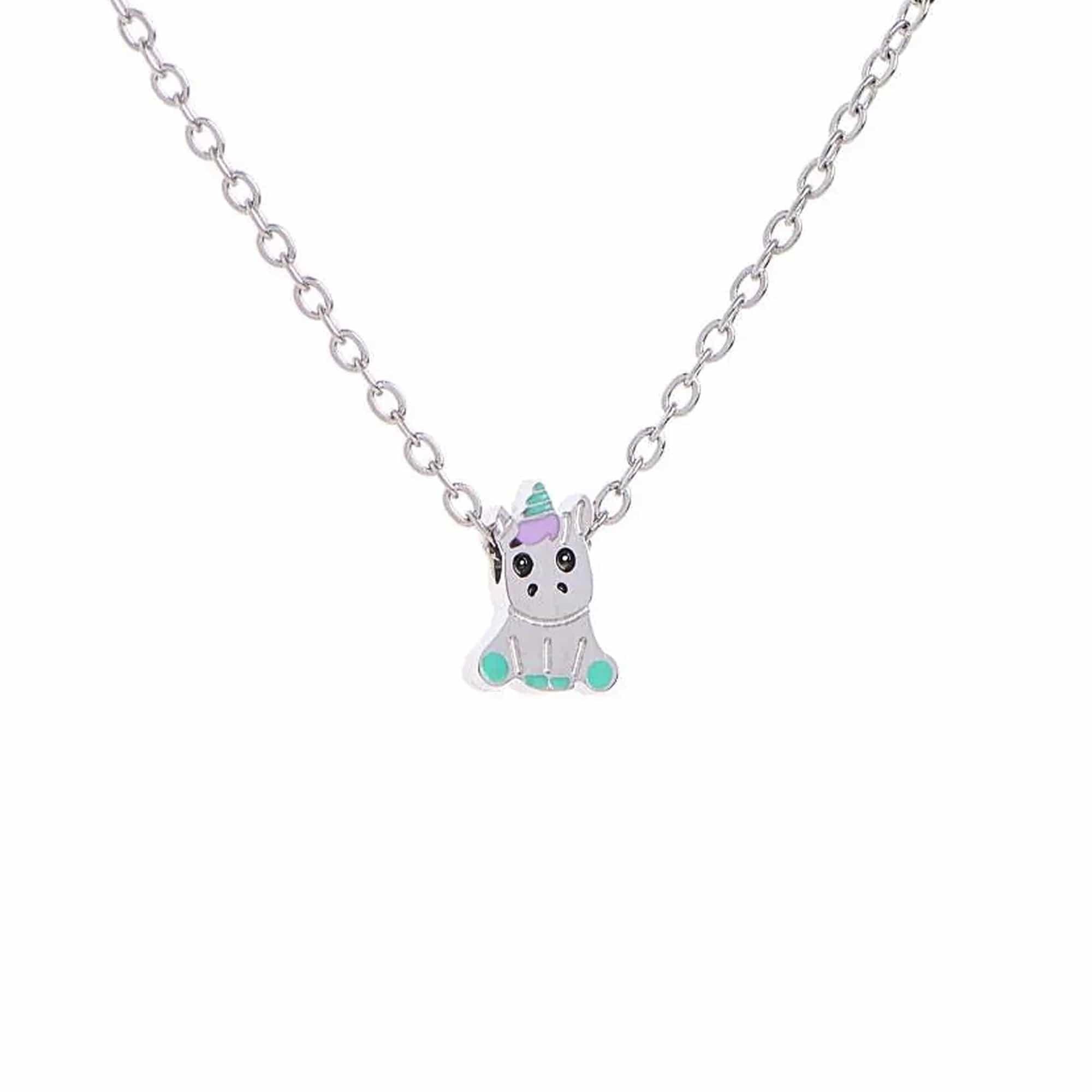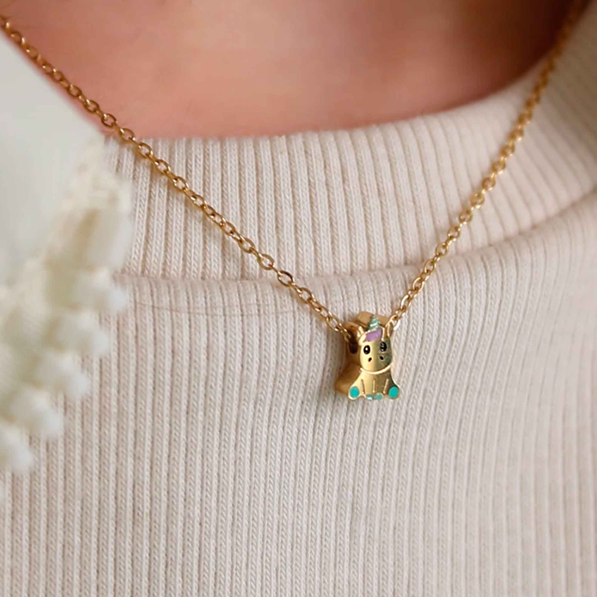 El Collar Unicornio combina la delicadeza de una cadena fina con un dije encantador en forma de unicornio, adornado con detalles coloridos como un cuerno multicolor y pequeños acentos turquesa. Su estilo juguetón y mágico lo convierte en un accesorio perfecto para niñas y amantes de la fantasía.
