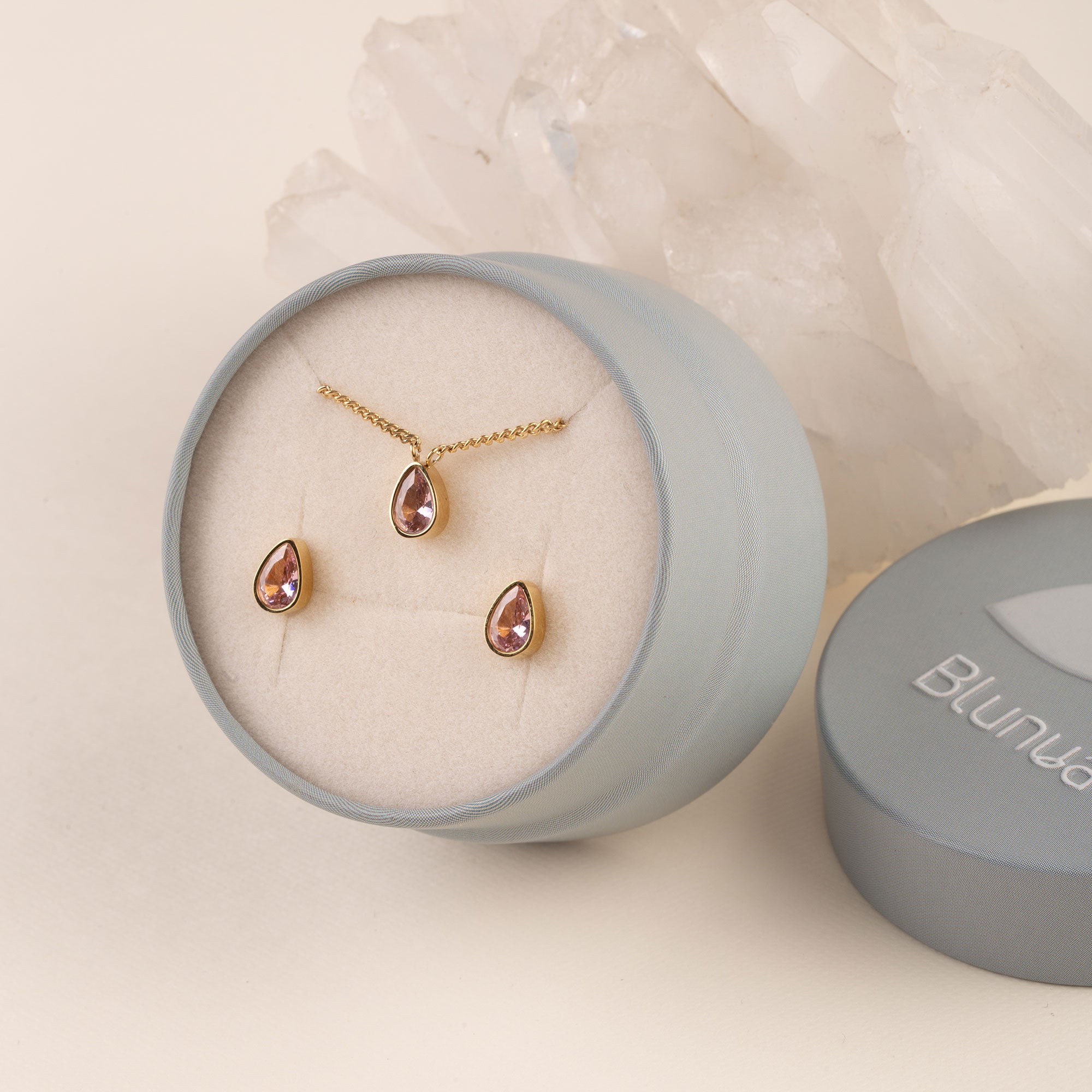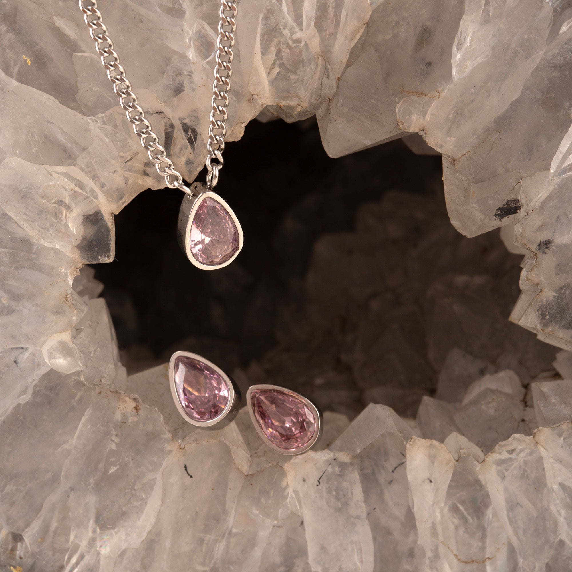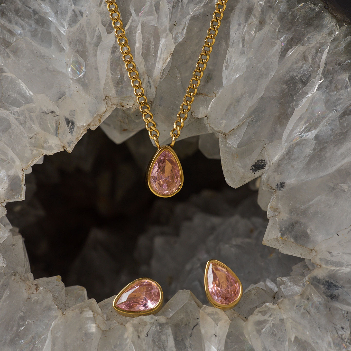 El collar presenta un dije con cristal zirconia cúbica rosa en forma de gota facetada, mientras que los aretes tipo topos repiten el mismo cristal en un formato más sutil, logrando una estética coherente y sofisticada.
