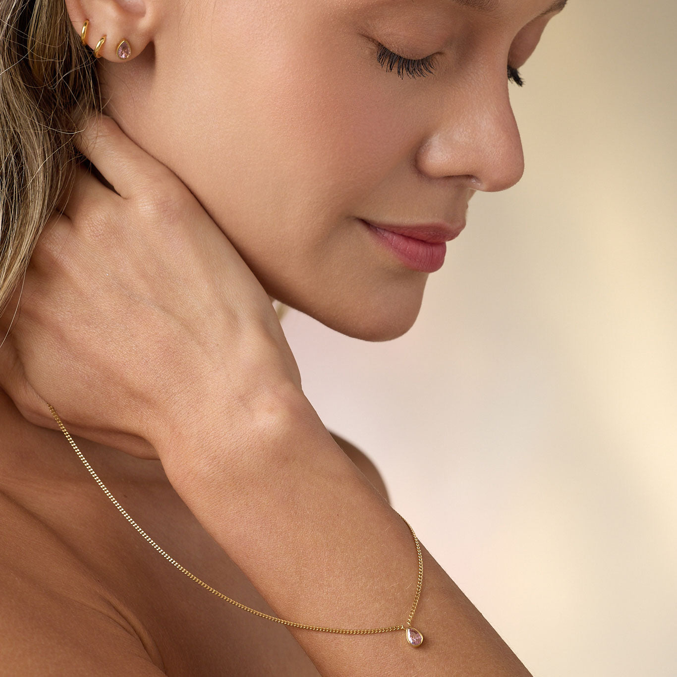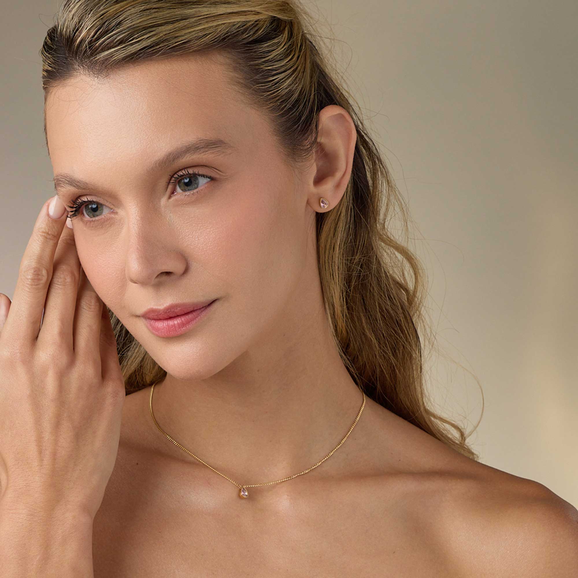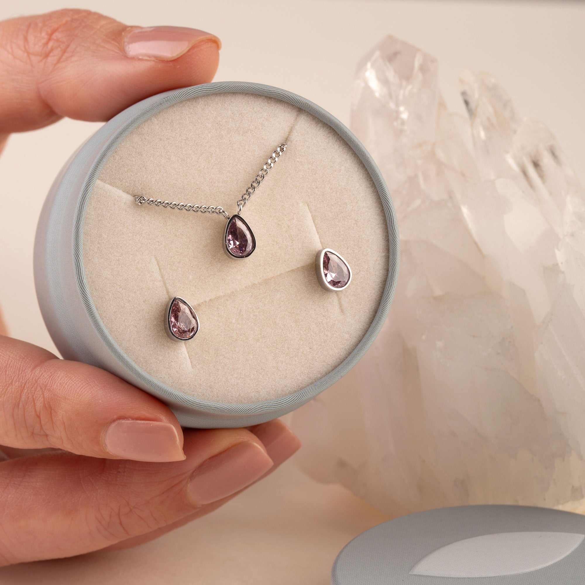 El collar presenta un dije con cristal zirconia cúbica rosa en forma de gota facetada, mientras que los aretes tipo topos repiten el mismo cristal en un formato más sutil, logrando una estética coherente y sofisticada.