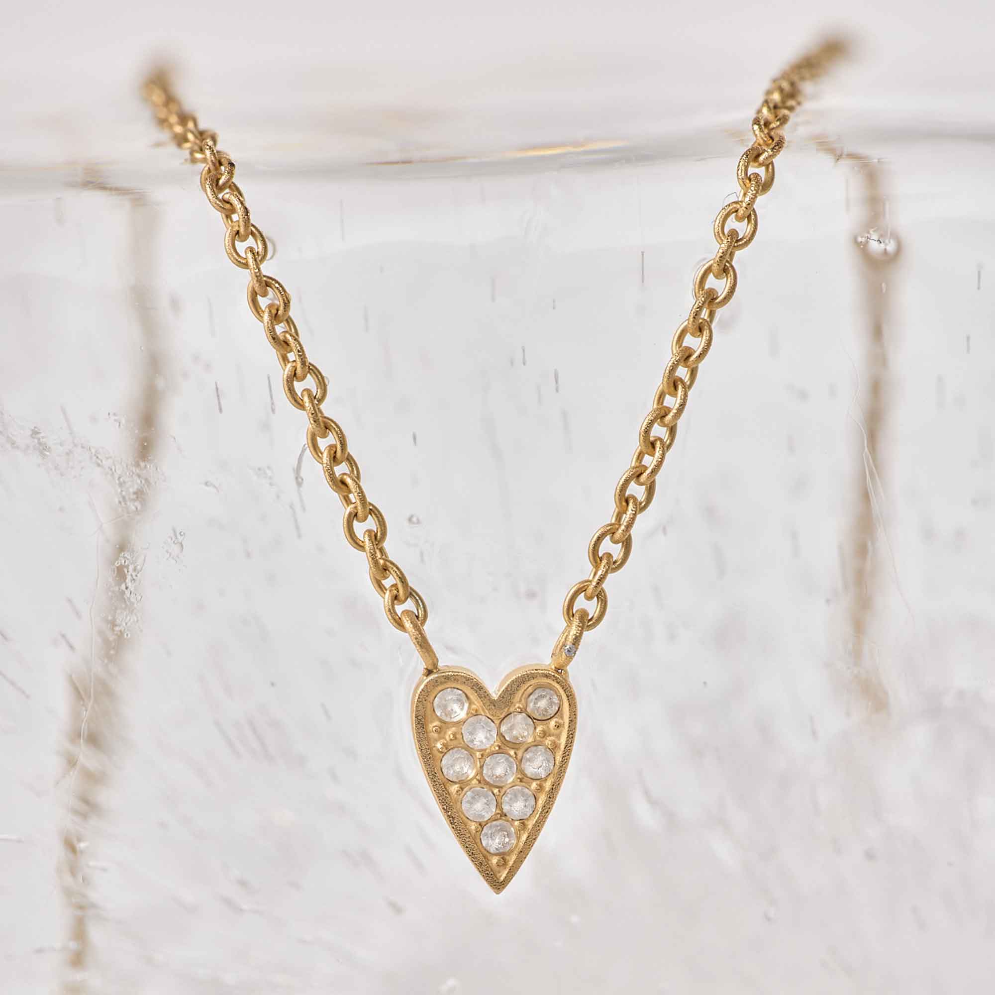El Conjunto Nébula, corazones que brillan con intención.  Está compuesto por un collar y un par de topitos que comparten un diseño de corazón facetado, adornado con pequeñas piedras claras que reflejan la luz con suavidad. Cada corazón está enmarcado por un bisel pulido a mano, creando un contraste cálido y elegante.