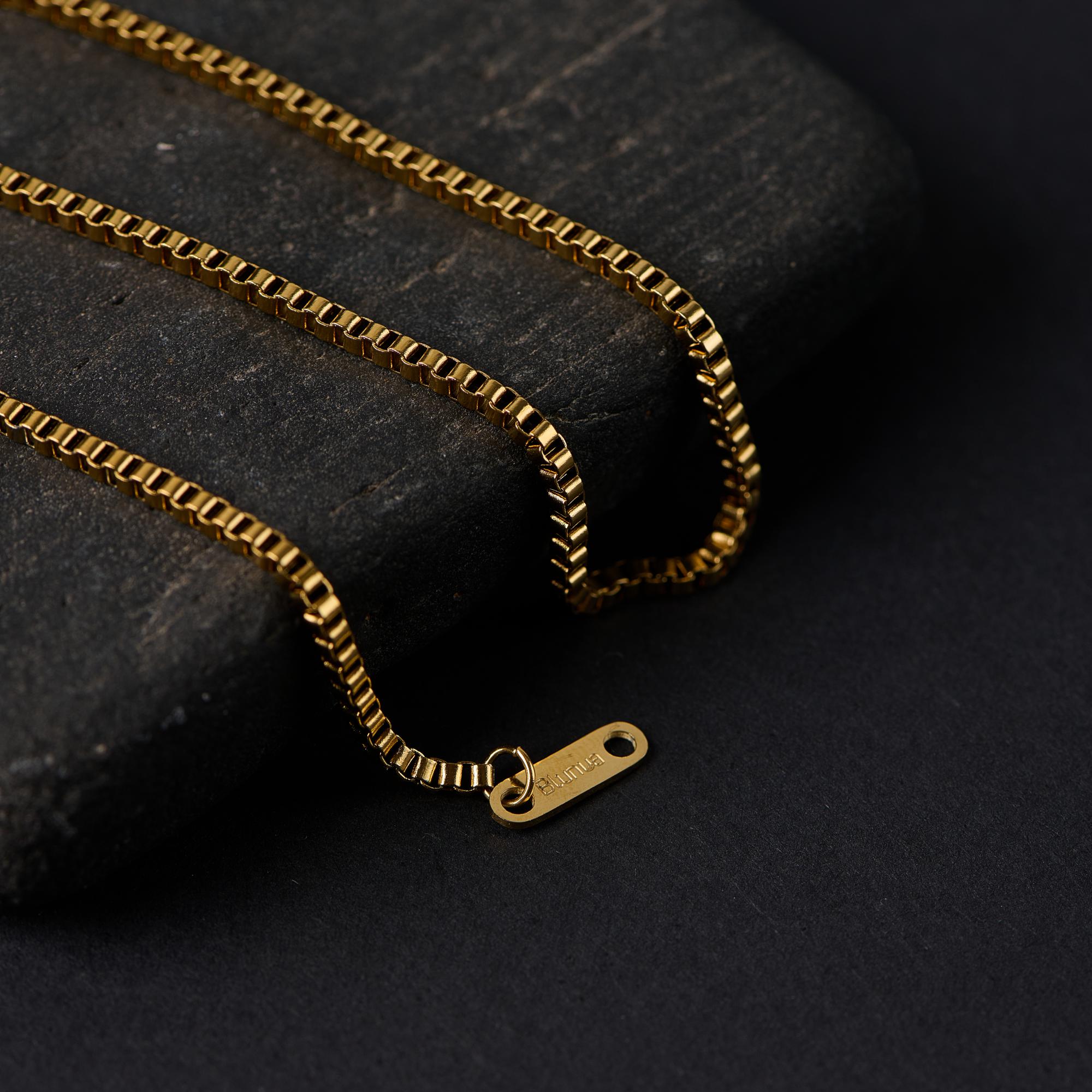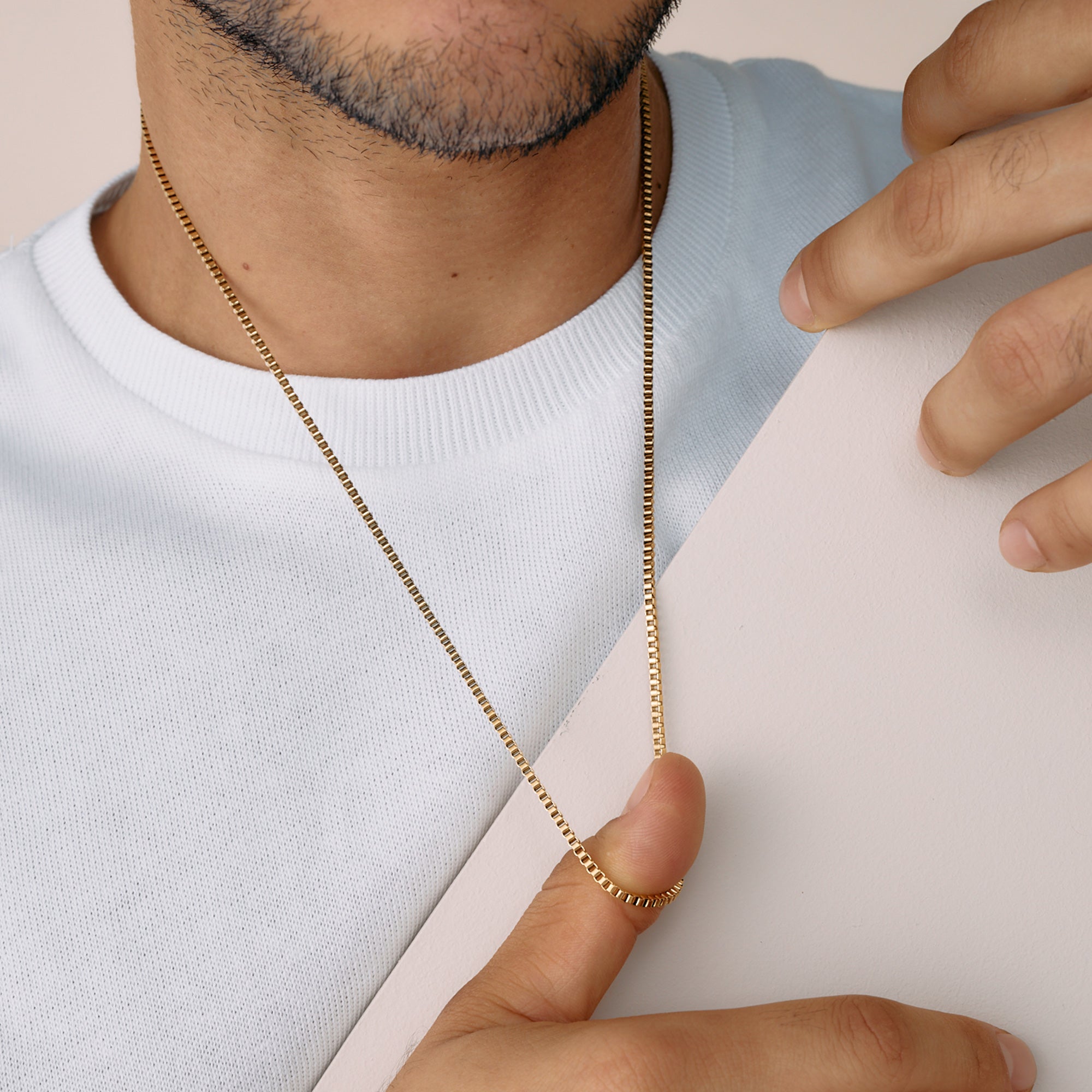 El Conjunto Quad incluye un collar y una pulsera con diseño de eslabones rectangulares. Su forma geométrica transmite firmeza y modernidad, con un acabado brillante que resalta sobre la piel.