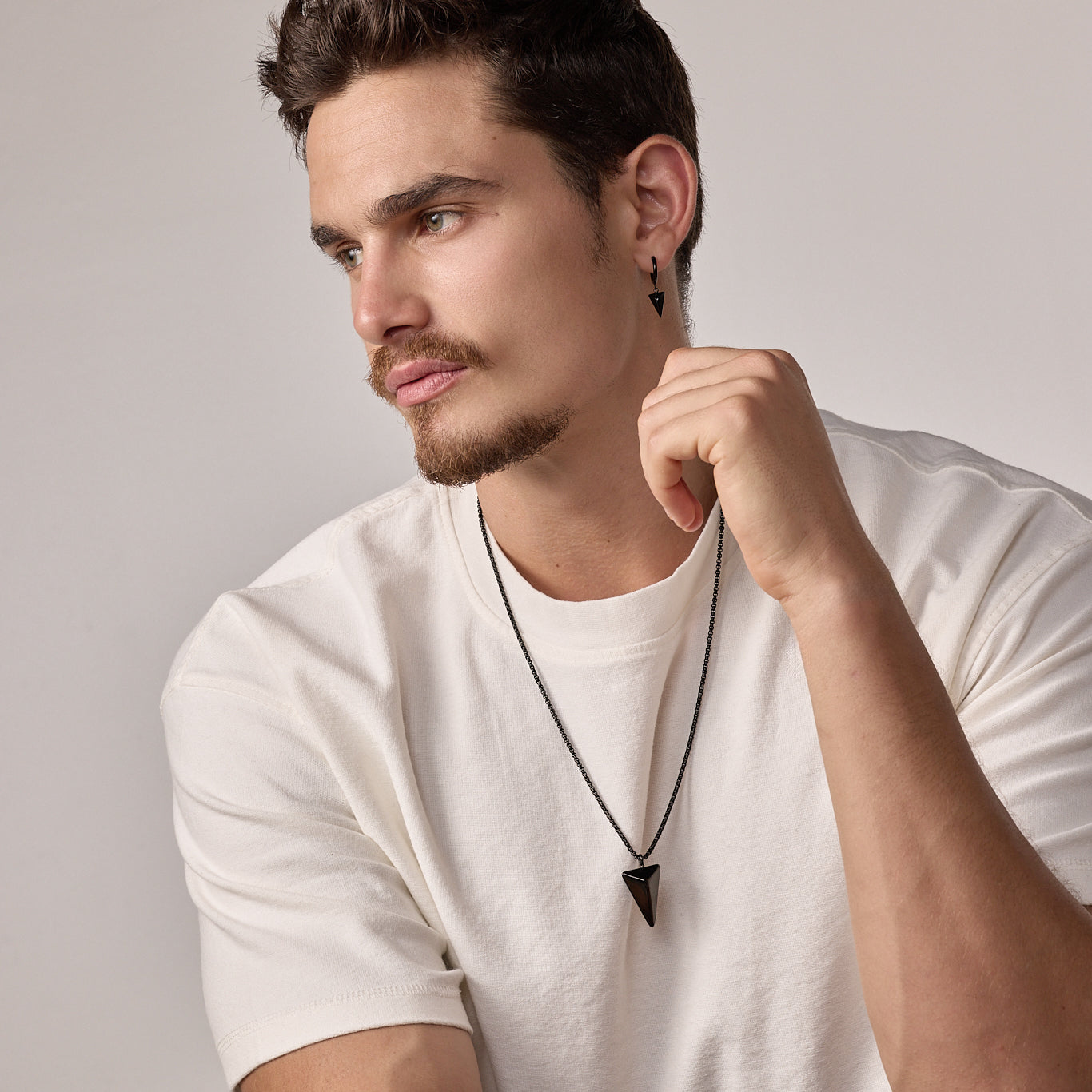 El Conjunto Vértice incluye un collar con dije triangular y una candonga solitario con diseño también triangular, ambos disponibles en acabado negro o plateado. Las formas angulares y el diseño minimalista transmiten fuerza, equilibrio y estilo contemporáneo, se convierte en un punto focal que resalta sobre la piel.