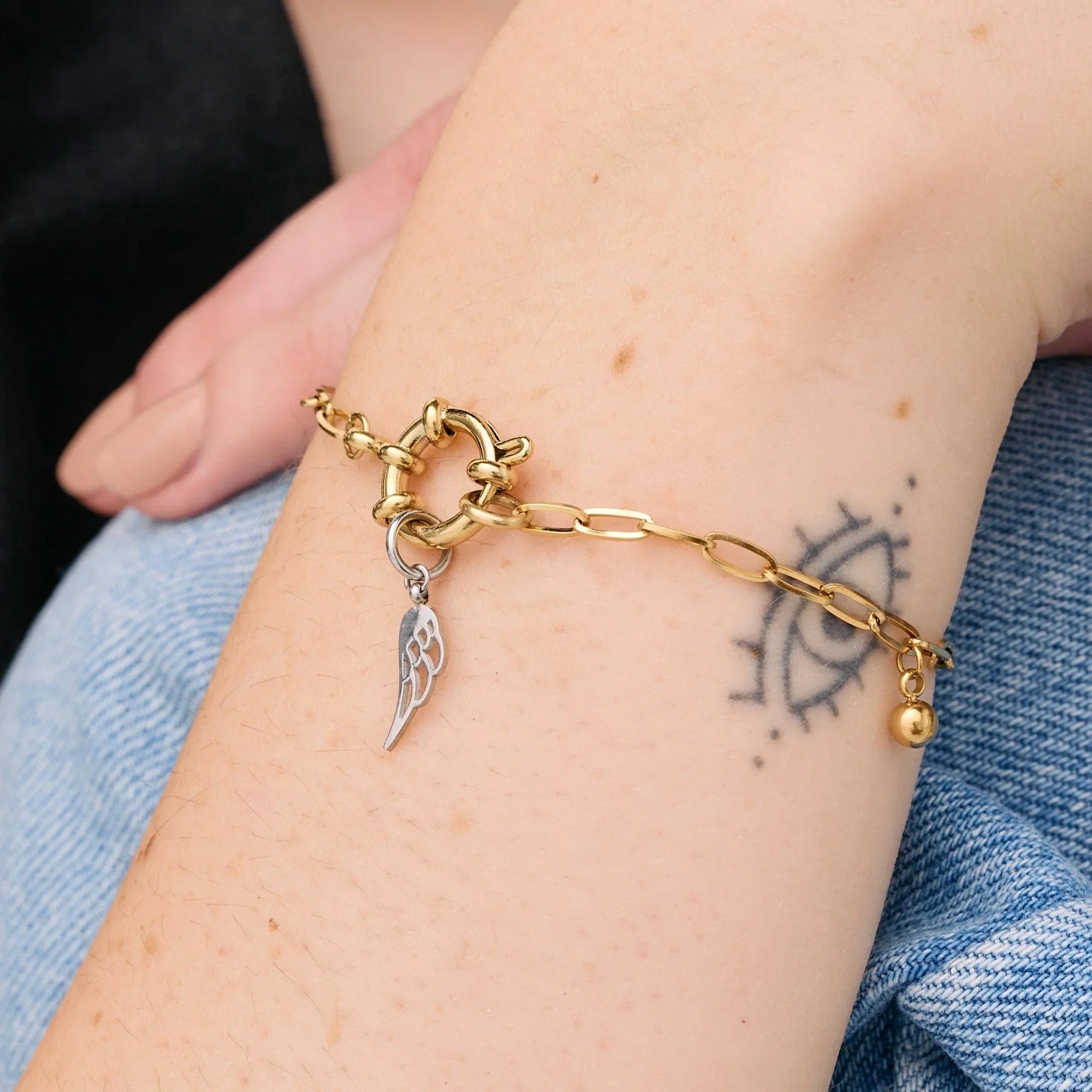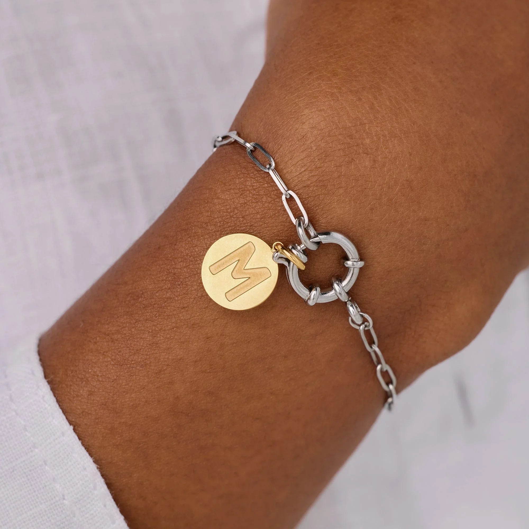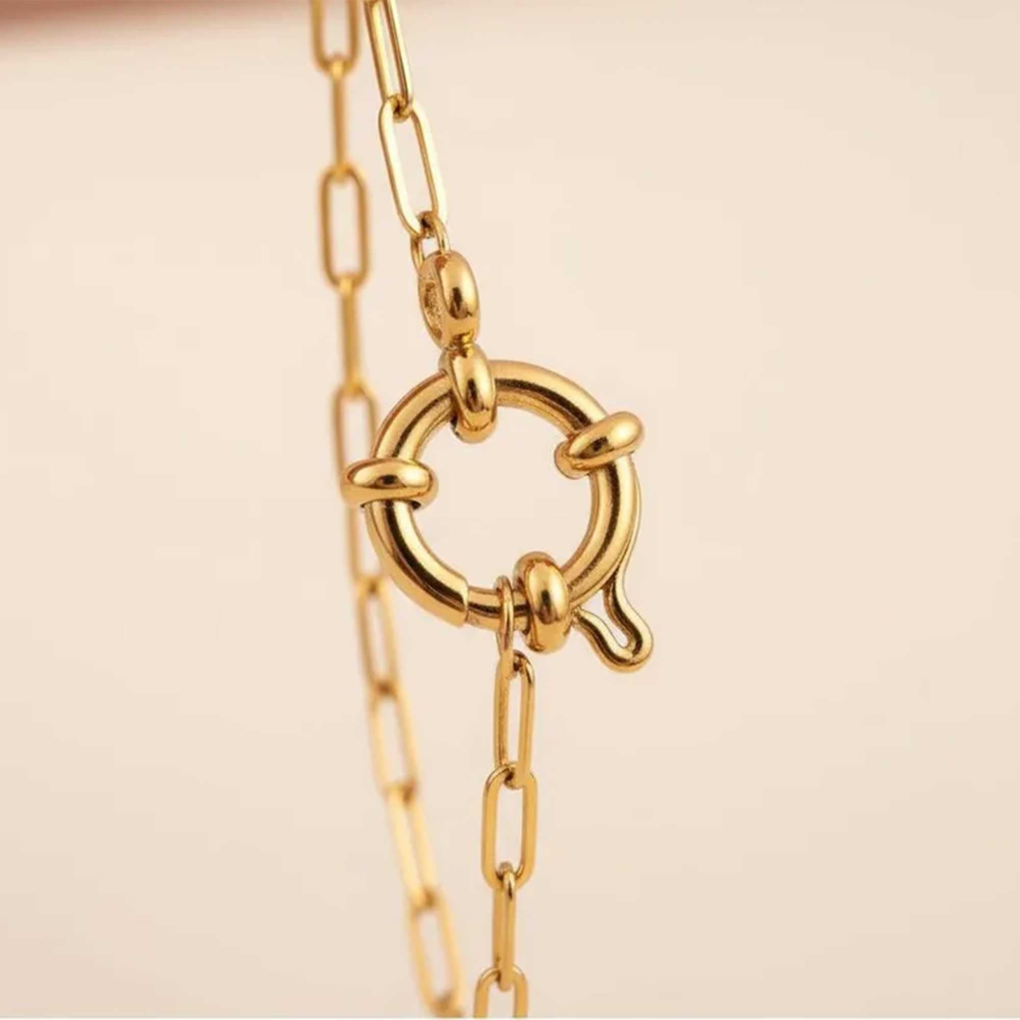 La Pulsera Lock Mini es una cadena de eslabones alargados con un centro circular entrelazado, como un candado simbólico y con estilo.
