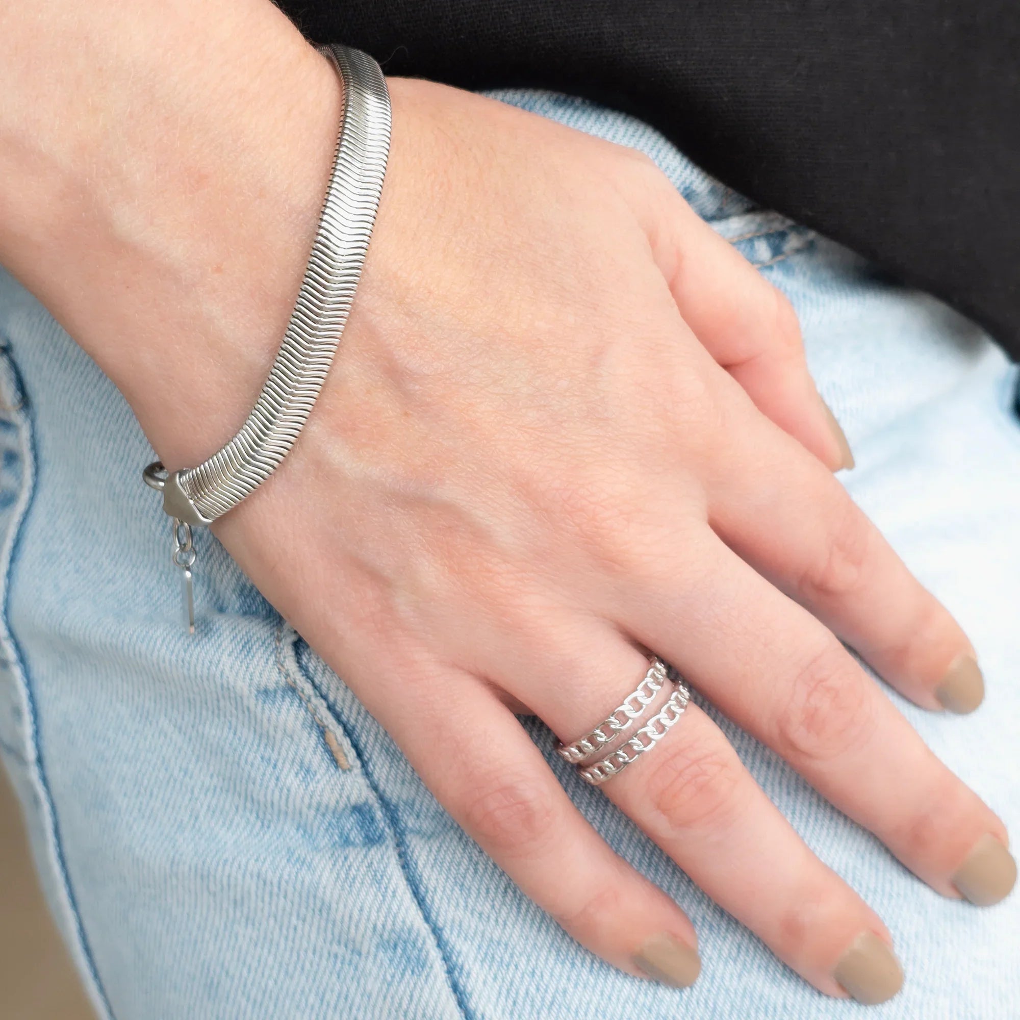 La Pulsera Mega se caracteriza por su diseño ancho y firme, con un patrón tipo espiga que refleja la luz en cada movimiento, aportando un efecto sofisticado y llamativo. Su acabado pulido transmite fuerza y estilo, convirtiéndola en una pieza protagonista dentro de cualquier look.