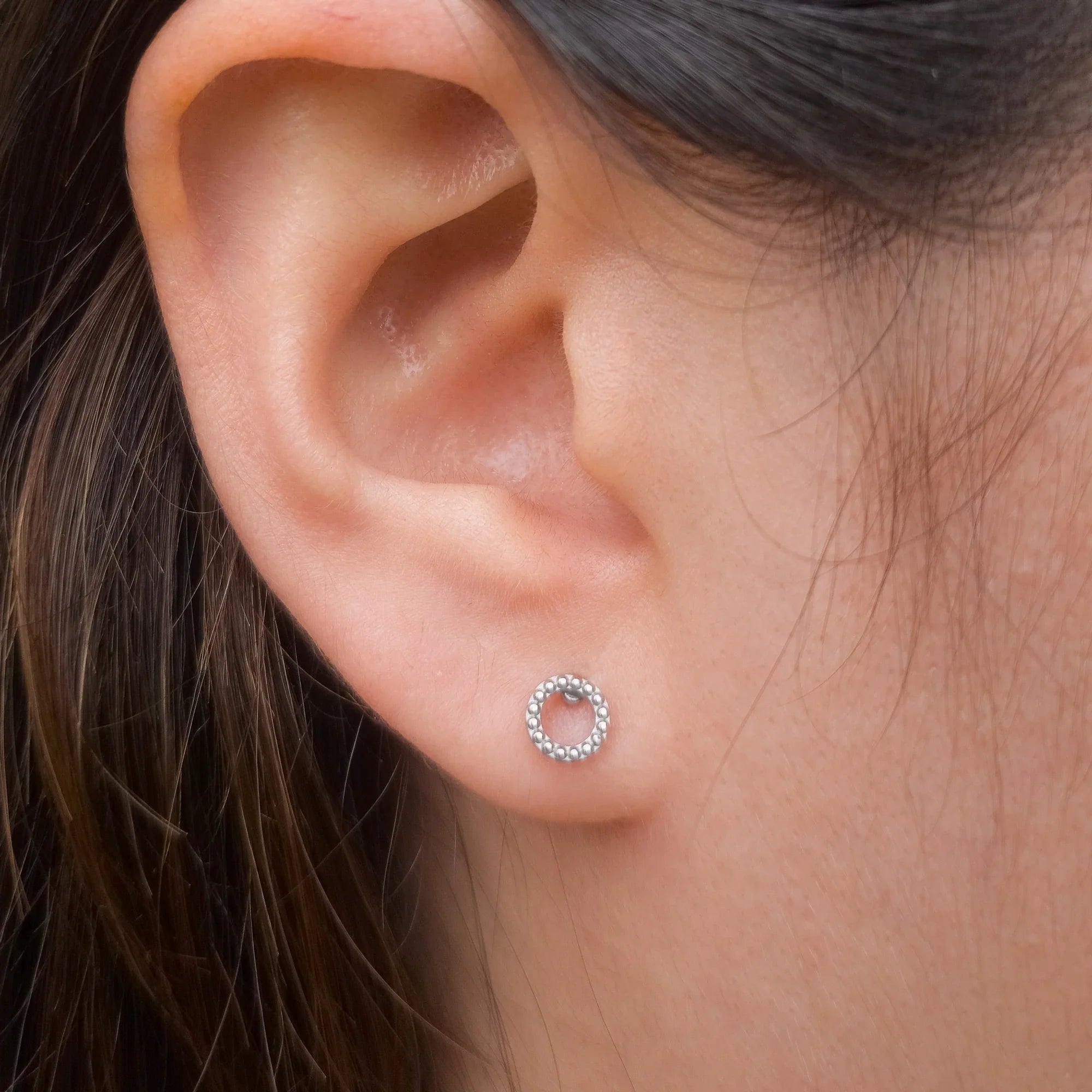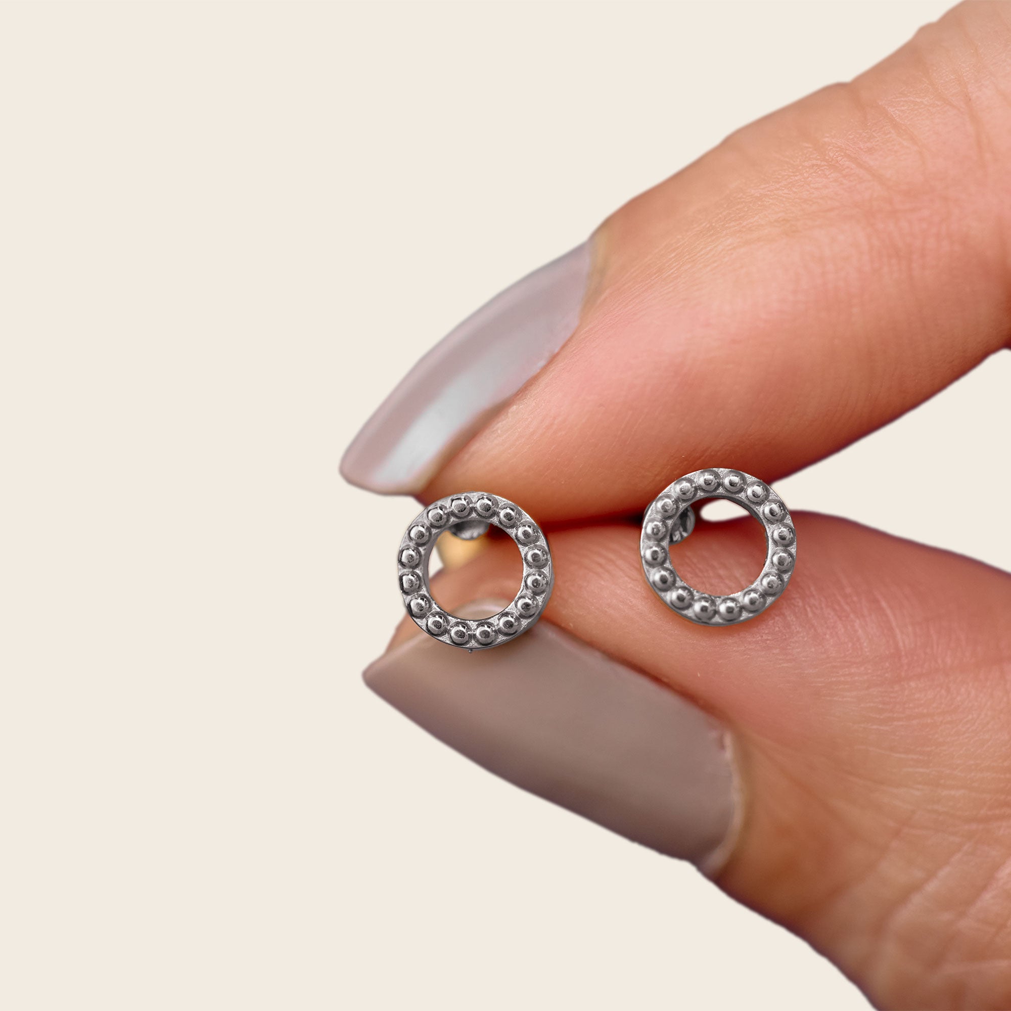 Los Topitos de Seguridad Balle son aretes pequeños en forma de aro con textura de puntos elevados, como una secuencia rítmica que envuelve el lóbulo con movimiento y elegancia. Su diseño combina lo clásico con lo táctil: una superficie que juega con la luz y aporta presencia sin exagerar. Son perfectos para quienes buscan una joya funcional, cómoda y con un toque de diseño.