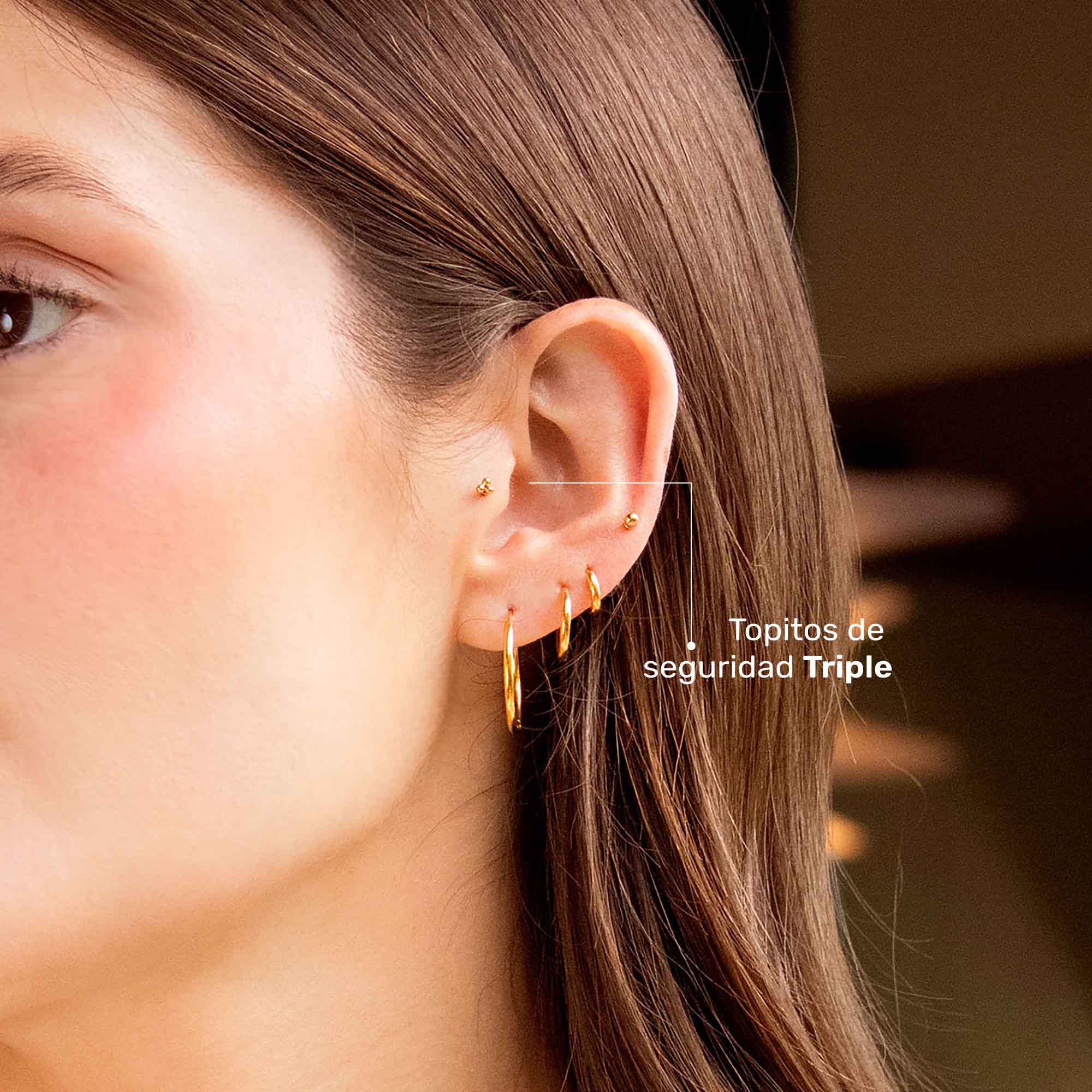Topitos de Seguridad Triple fabricados en acero inoxidable hipoalergénico con diseño de tres bolitas delicadas. Su cierre a rosca asegura un ajuste firme y cómodo, ideal para uso diario. Perfectos para un look minimalista y para acompañar aretes o candongas más grandes.