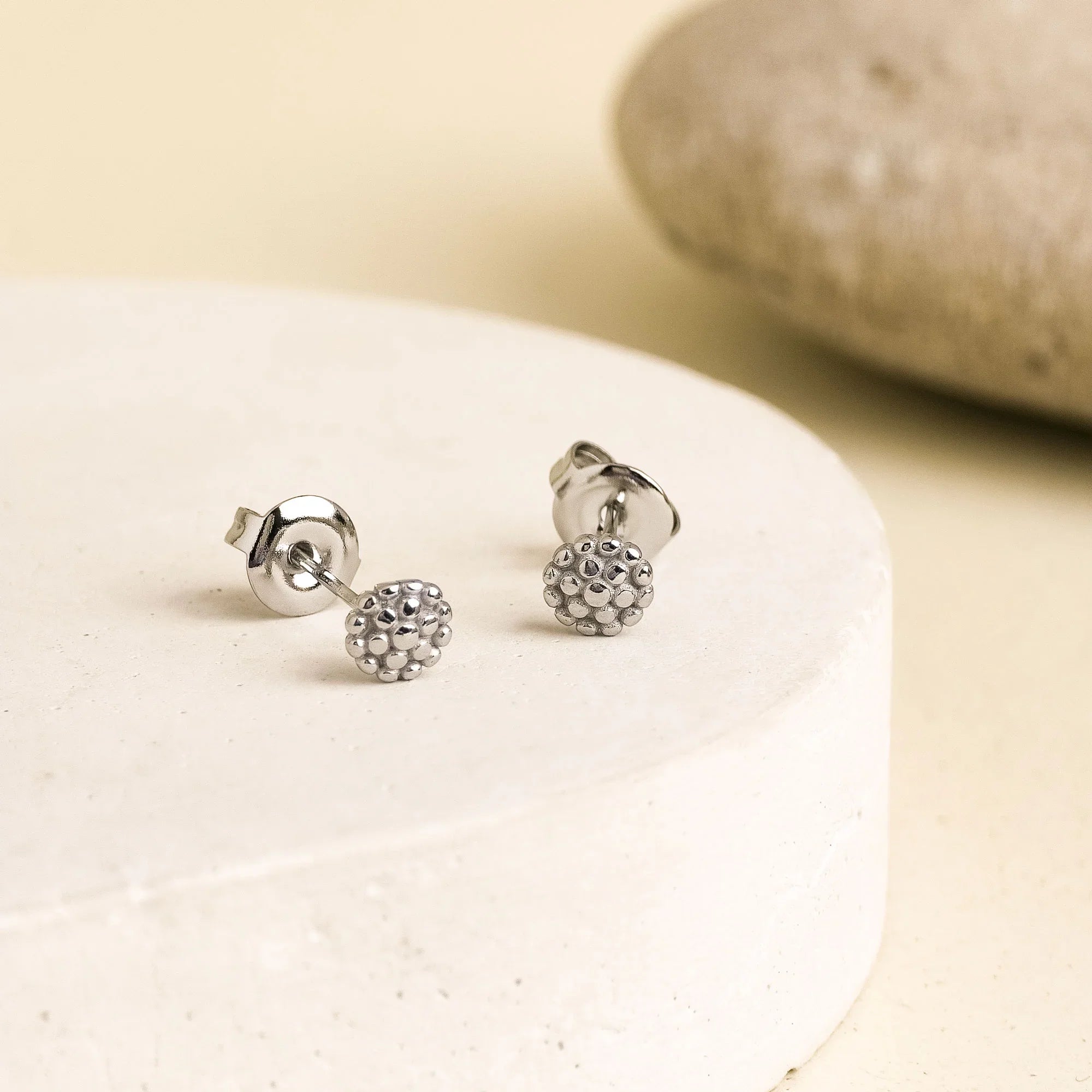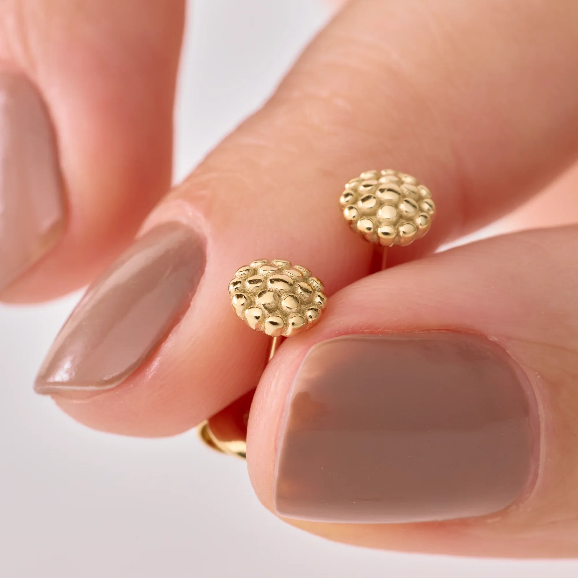 Los Topitos Nebulosa son esferas con relieve de puntos elevados, como pequeñas constelaciones que se posan sobre el lóbulo. Su diseño evoca la profundidad de una galaxia en miniatura: delicado, táctil y lleno de luz. Son perfectos para quienes buscan una joya discreta, pero con carácter, que combine lo clásico con lo inesperado.